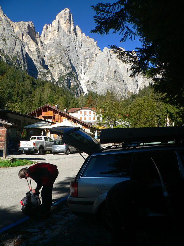 Rozhodnuté: v Cortine len raňajky a preč! Vydávame zákaz fotenia, ale aj tak stojíme za každou zákrutou – vychádzajúce slnko robí neskutočné divy: Passo Tre Croci a nad ním Monte Cristallo, oranžové Tofany nad Cortinou, Passo Falzarego, Passo di Cereda – až o 11:00 konečne kotvíme. Cestou ešte zháňame mapu. Po sezóne všade mŕtvo, ale parkovisko zadarmo :-)