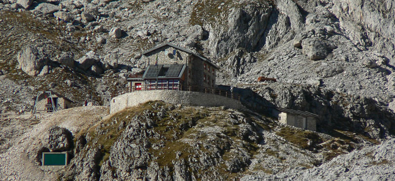 Pojeme čosi, pokŕmime vtáky-žobráky (prídu blízko, ale z ruky nezobú) a hybaj na preliezky. Sutina pekne gravitačne vytriedená, dole balvany, vyššie štrk. Na niektorých miestach je ho až príliš, najviac sa šmýka úplne hore. Sedáky neobliekame, dá sa to chodiť, len lana sa treba pridržať. Prilby treba, často skalka spod nôh uletí. Mocujeme sa hore žľabom necelú hodinu, je to strmina, ale teplota v tieni príjemná. Sponad žľabu sa otvárajú výhľady do doliny a keď si kúsok zájdeme opačným smerom, aj na Rifugio Pradidali a sedlo nad ním.