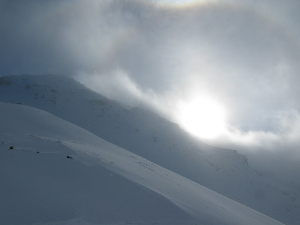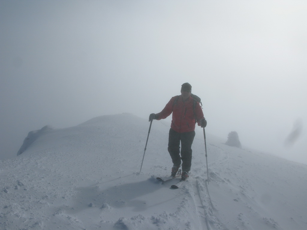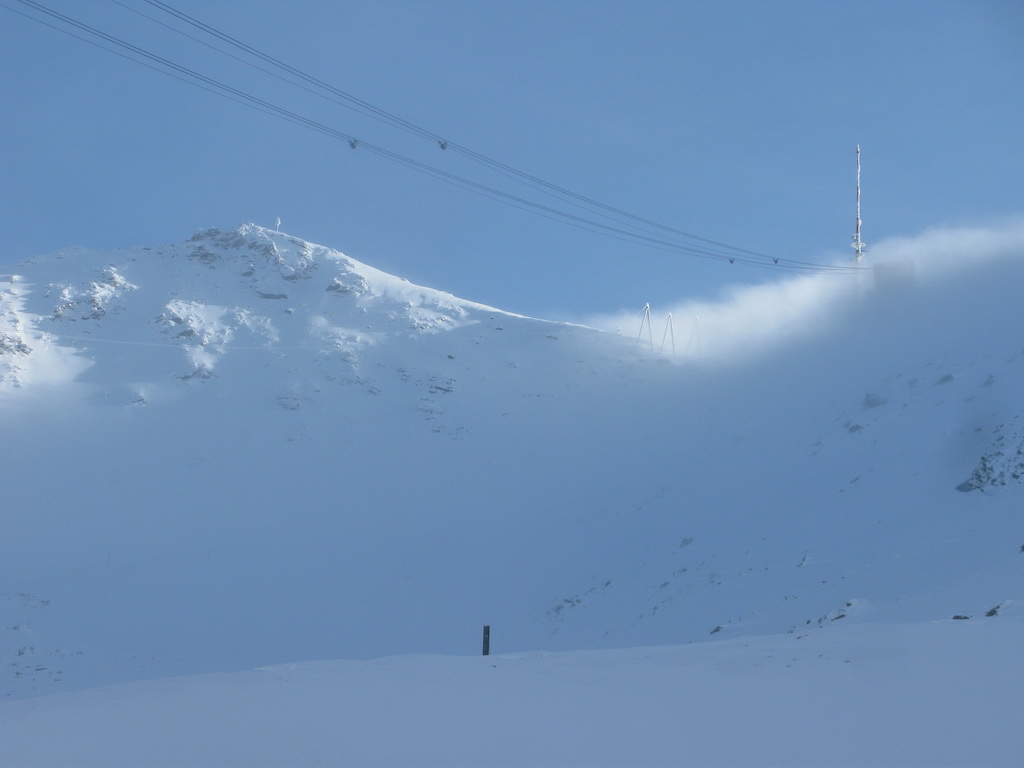 Aj preto sme si zvolili dnes Lagalb. Ešte som tam nebol a stále je mimo prevádzky. Výborý tip na úvod a do takéhoto kadejakého počasia. Po vyšliapaní po zjazdovke k hornej stanici nasleduje ešte cca 50 v.m. na vrchol po vysneženom hrebeni. S lyžami sa dá vyjsť až hore.
