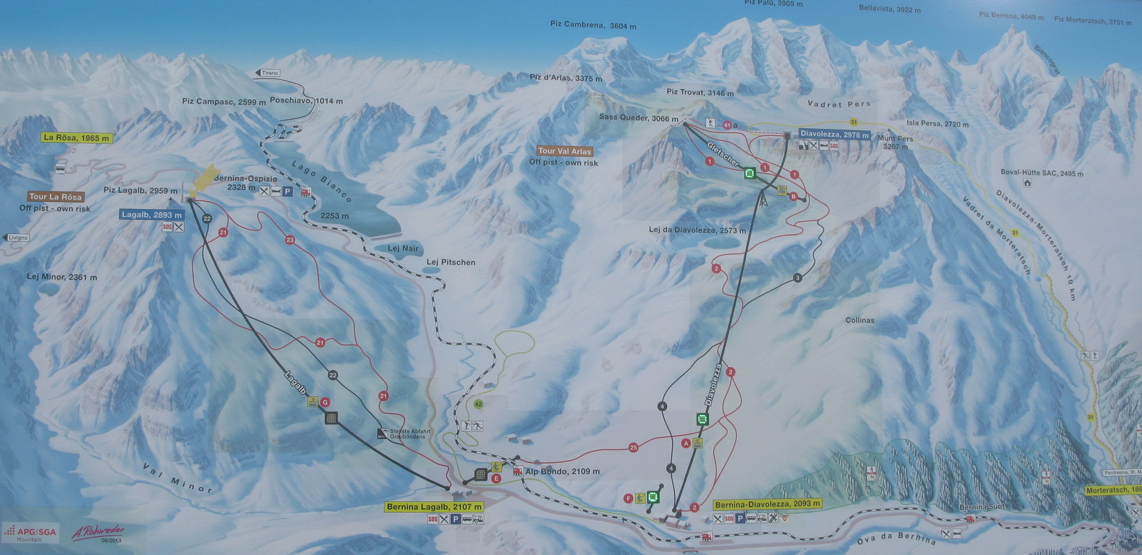 Info: Lanovka na Diavolezzu (oproti Lagalbu cez cestu) slúži neskôr aj na nástup na túru na Piz Palú, jednu z najkrajších skialpových túr v okolí.