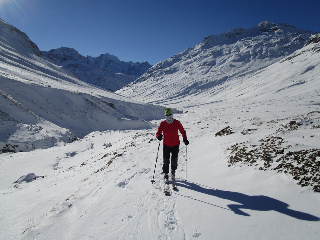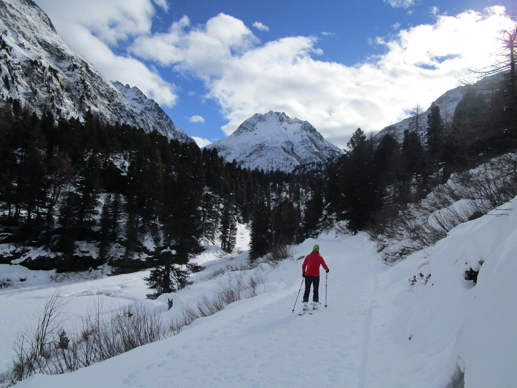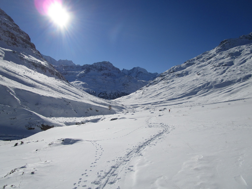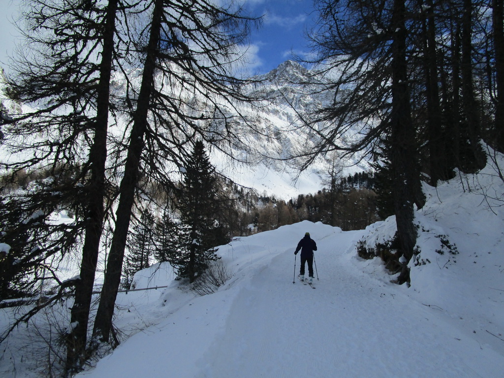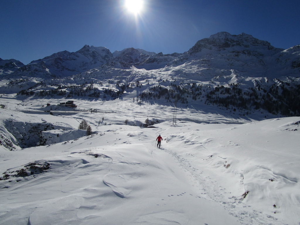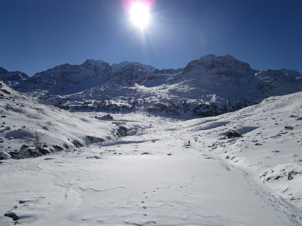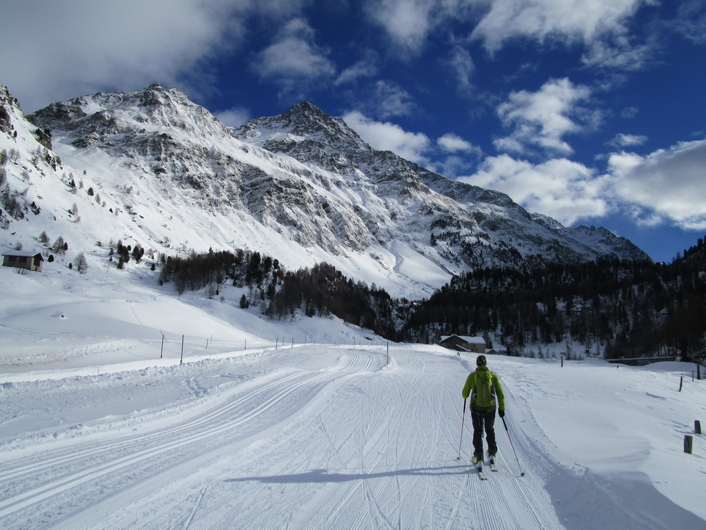 Val de Fain už poznáme z letných bajkovačiek. Mierne údolie, tiahnuce sa v smere od dolnej stanice Diavolezzy, končí sedlom La Stretta. Toto sedielko je bajkerský pojem. Parkujeme na parkovisku pri dolnej stanici Diavolezza, parkovné bezplatné. Musíme s lyžami v ruke prejsť cestu, kúsok ideme popri nej smerom dole na Pontresinu a po asi 100 metroch sa už napojíme na stopu, ktorú prešliapali hlavne šliapači so snežnicami. Dolinou mierne hore krásna prechádza po slniečku v cca -15, a potom čiastočne na lyžiach (a stredný úsek aj znovu na pásoch) sa vrátime dole. Stav snehu sme zmonitorovali, bieda preveliká. Aspoň trošku sme sa na pásoch pošúchali... Cca 3-4 hodiny.