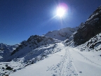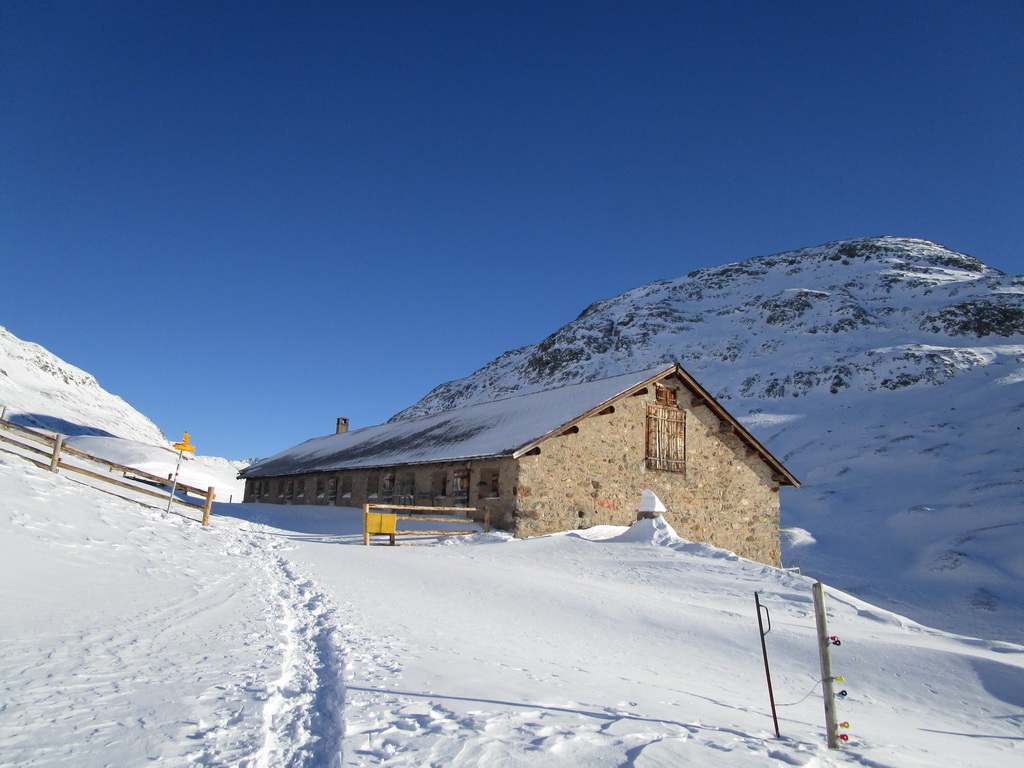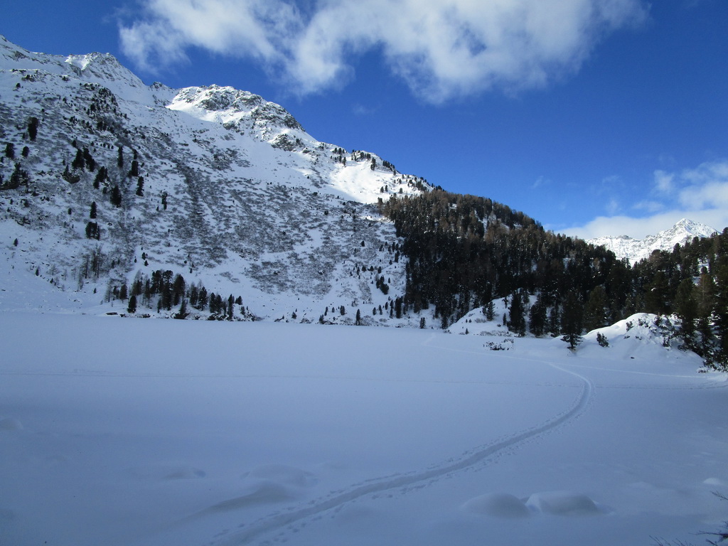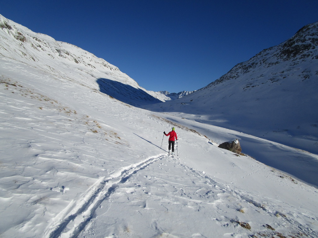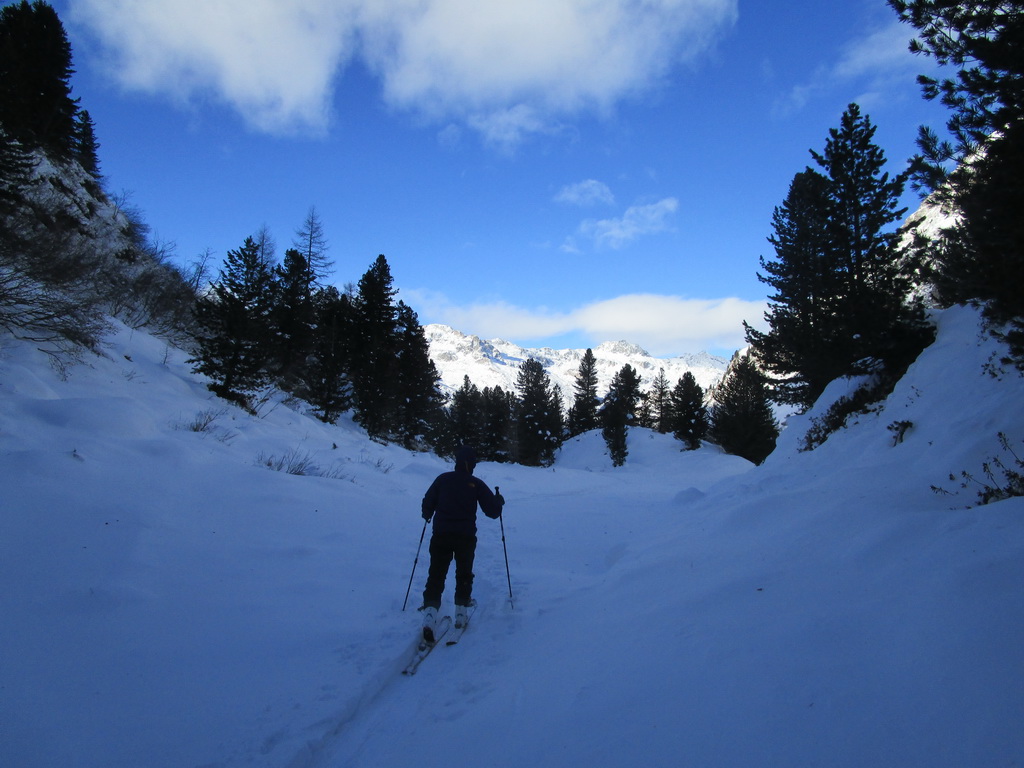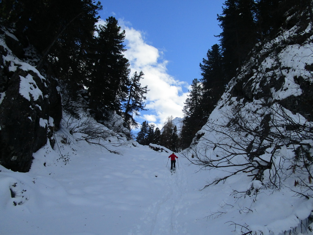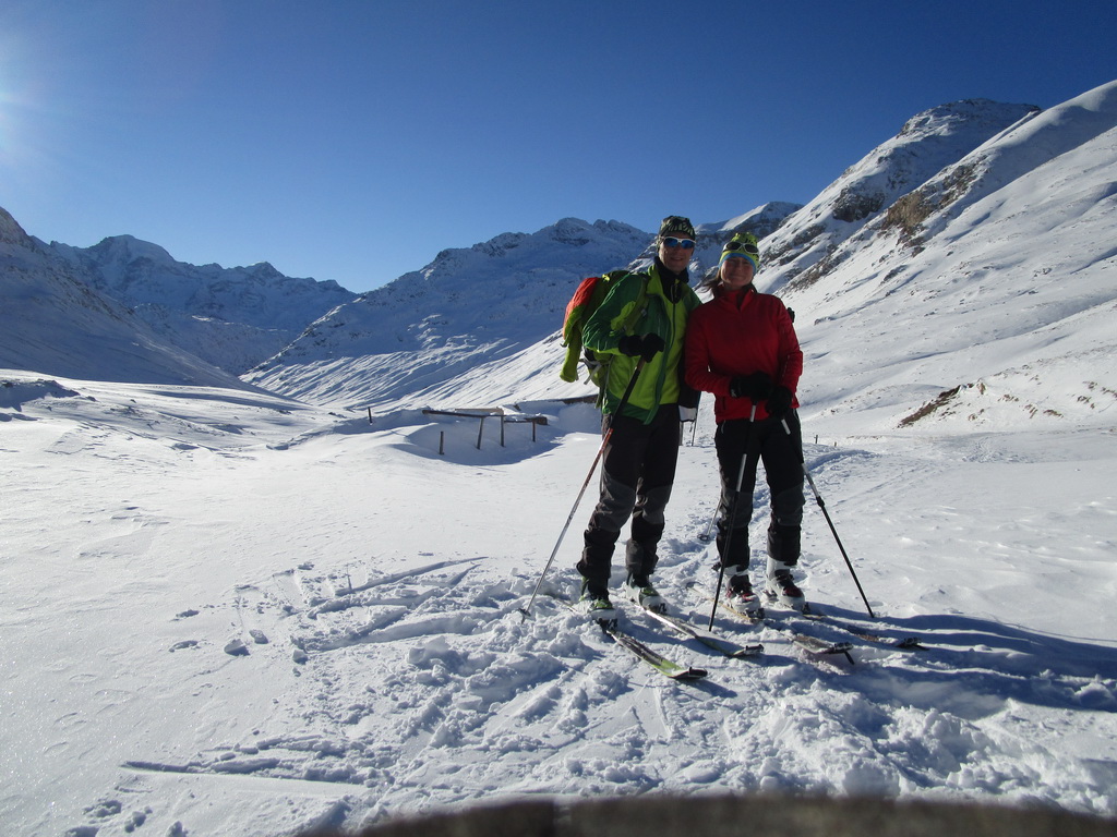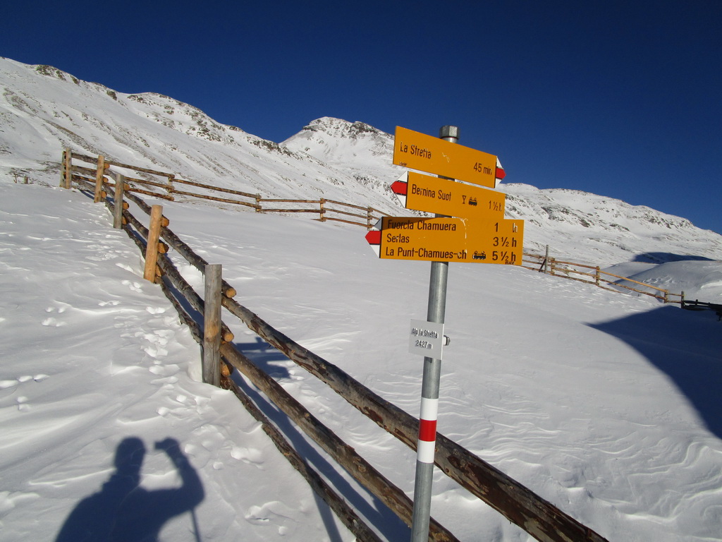 Val de Fain už poznáme z letných bajkovačiek. Mierne údolie, tiahnuce sa v smere od dolnej stanice Diavolezzy, končí sedlom La Stretta. Toto sedielko je bajkerský pojem. Parkujeme na parkovisku pri dolnej stanici Diavolezza, parkovné bezplatné. Musíme s lyžami v ruke prejsť cestu, kúsok ideme popri nej smerom dole na Pontresinu a po asi 100 metroch sa už napojíme na stopu, ktorú prešliapali hlavne šliapači so snežnicami. Dolinou mierne hore krásna prechádza po slniečku v cca -15, a potom čiastočne na lyžiach (a stredný úsek aj znovu na pásoch) sa vrátime dole. Stav snehu sme zmonitorovali, bieda preveliká. Aspoň trošku sme sa na pásoch pošúchali... Cca 3-4 hodiny.