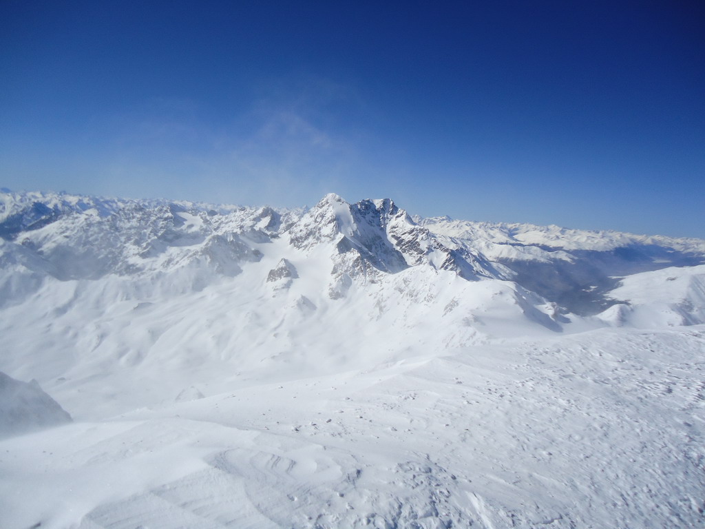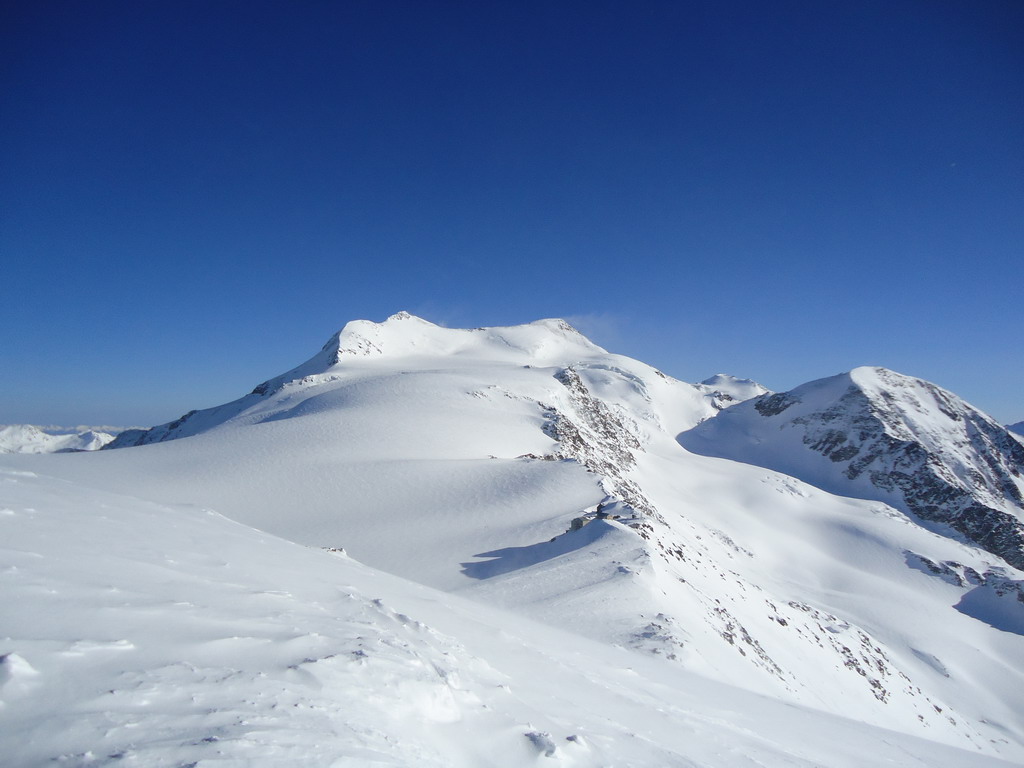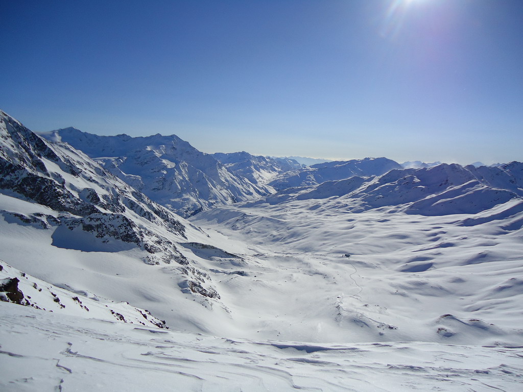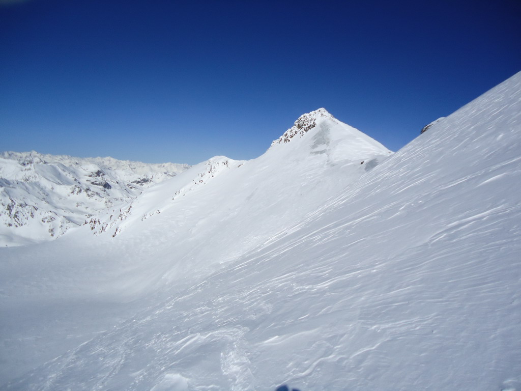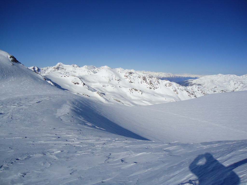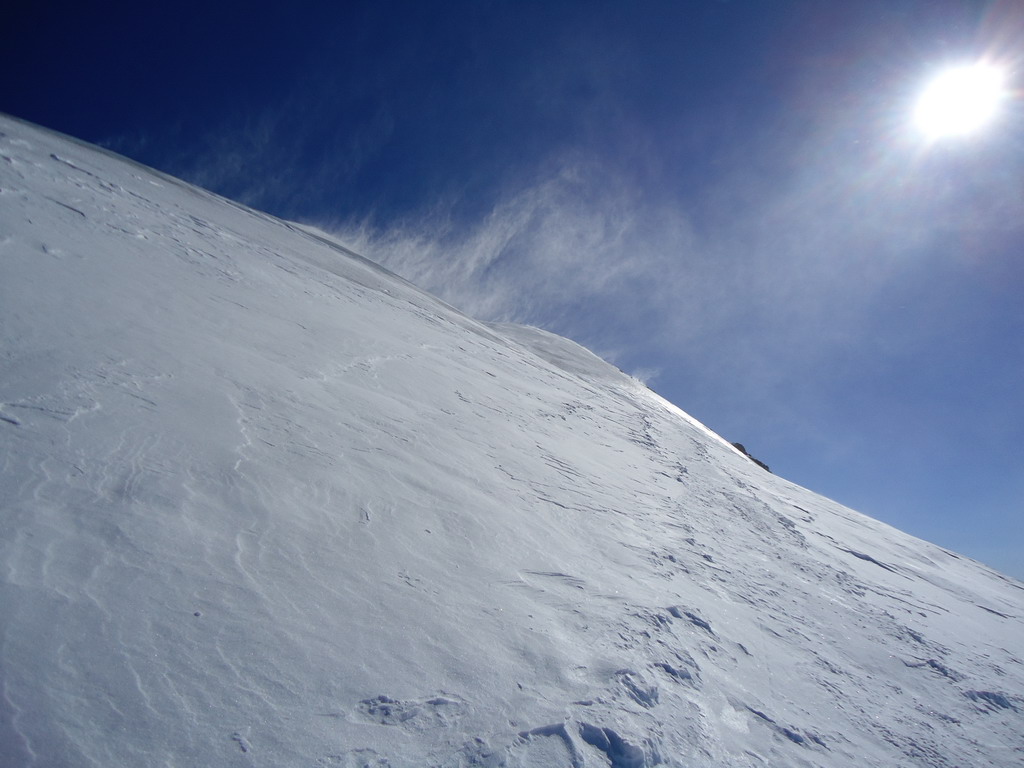Tu už stopa chýba celkom a tak musím prešliapávať ja. Spúšťam sa krátky zjazd na pásoch, v prašane to ide super a pokračujem platom popri chate Casati. Začína fúkať vietor a stopa vedúca z Marteltallu sa stráca. Od vetra sú narobené nepríjemné vlnky a šliapať stopu na ľahkých drievkach tiež nie je nič moc.