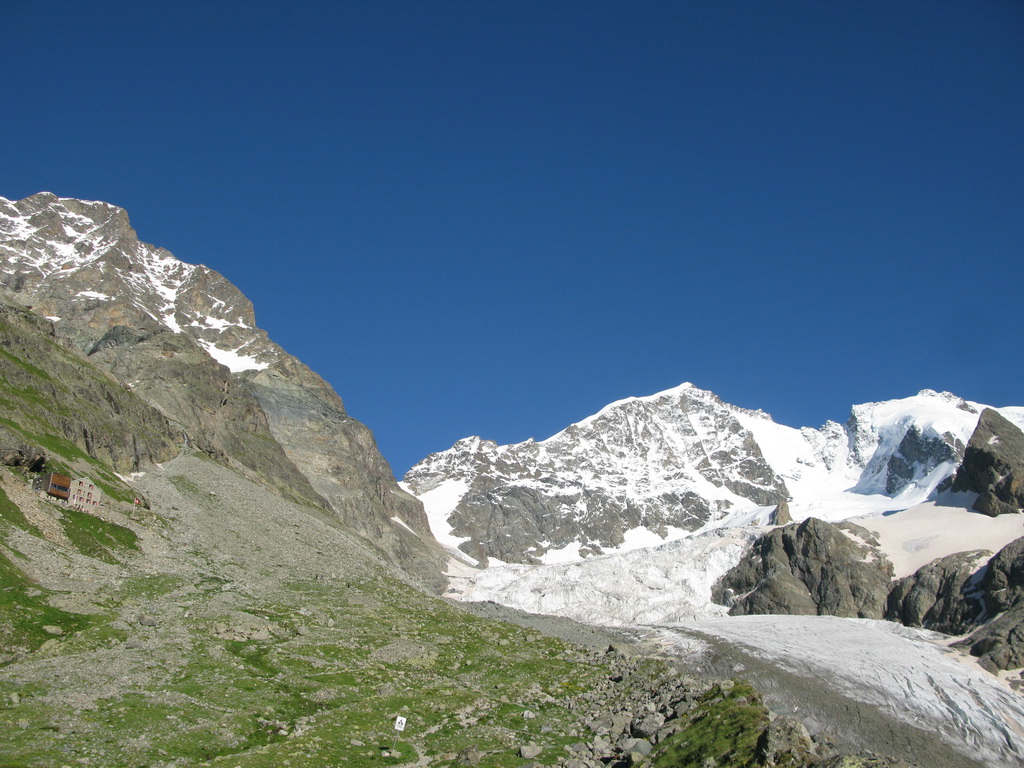 Na terase postávajú dvaja starší páni s ďalekohľadom. Pozorujú Biancograt. Ináč tu nie je nikto. Na túry sa z chaty vyráža skoro ráno. Pýtajú sa ma kam idem.