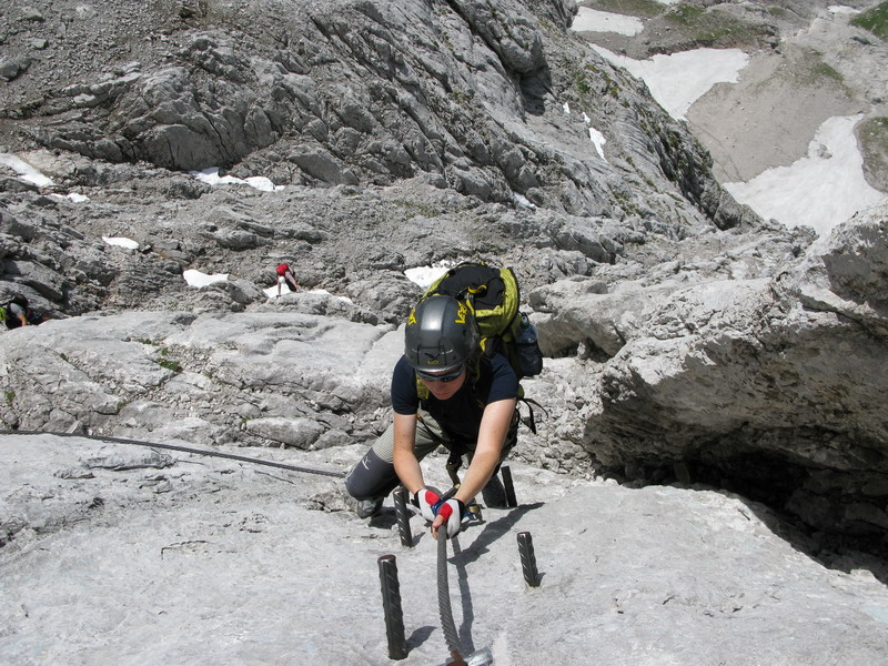 Zostupujúc si dáme pozor na okrajové trhliny a už sa šmýkame dole po snehu, Tí s väčšími chodidlami majú trošku výhodu: aspoň na dačo mi sú tie lode dobré haha. Na stanicu prichádzame už po záverečnej a tak si dávame pri zostupe ďalšiu ferratu, tentoraz však smerom dole.