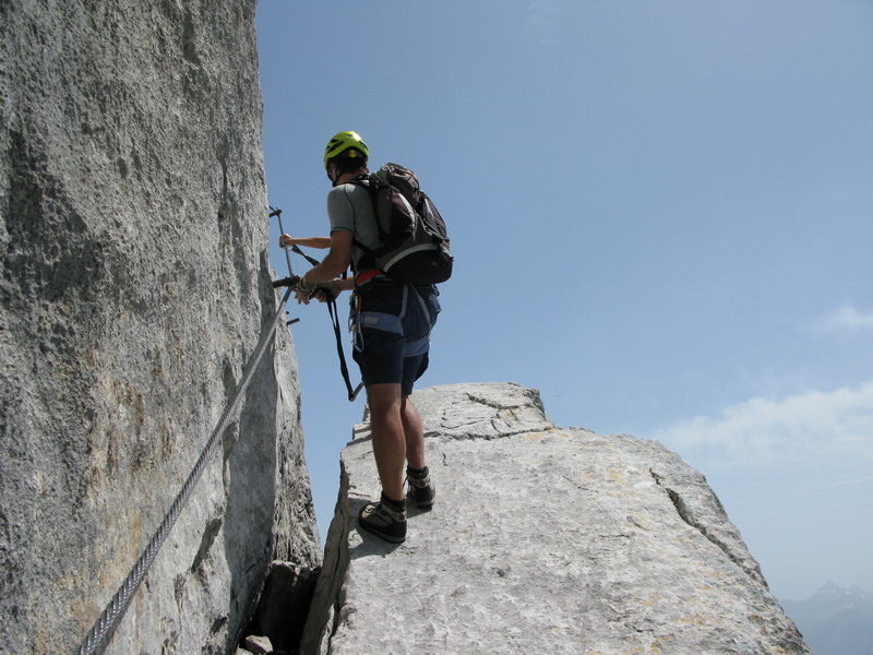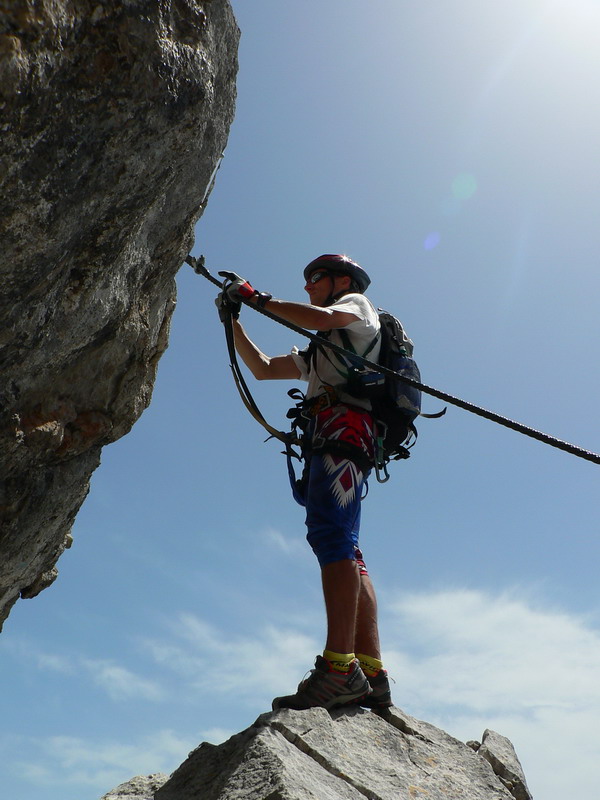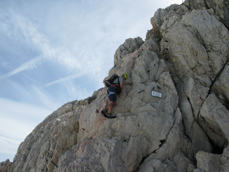 Pri chôdzi mokrým snehom zbadáme vľavo v skale ferratu vedúcu hrebeňom na vrchol. Rozhodujeme sa pre ňu, po skale je to predsa len lepšie ako po chladnom snehu. Na vrchole sme pred štvrtou a to už nasleduje eufória z nádherného dňa.