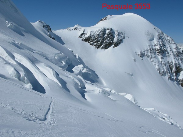 Sneh je super, čistý prach a tak bez problému zídem pod Pasquale na pásoch. Okradol som sa sice o pár oblúčikov v prachu, ale o tie mi dnes až tak nejde. Kdesi v podvedomí mi koluje myšlienka