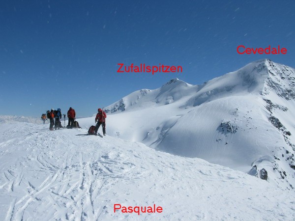 Odpovedám a už si pripínam lyže na nohy. Pásy neodlepujem, pod Zufallspitze sa dostanem aj na pásoch. Po krátkom výšlape som pod vrcholom. Je to tu tiež ako na Václaváku. Prevažujú Taliani, ktorí vyšliapali z Martelltalu. Na malom vrchole je tlačenica, spravím nejaké fotky Talošom, opačnú možnosť nevyužívam a vraciam sa k lyžiam.