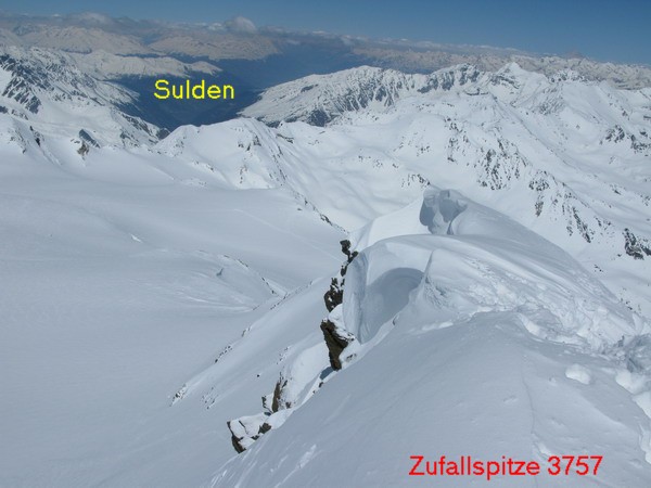 Z vrcholu som si pozrel traverz, ktorý bude treba prekonať k malému Zufallspitze a nebol som nadšený. Už na lyžiach prichádzam k preveju a chcem sa pozrieť, či by som sa odtiaľ nedostal do steny. Z vrcholu na mňa začnú kričať, aby som nešiel na prevej. Púšťam sa preto na lyžiach trochu nižšie, odtiaľto sa dostanem do traverzu ľahšie.