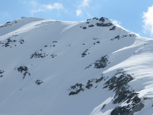 Pozorujem okraje lavíny a nevidím žiadne stopy, vtom zbadám stopu ako niekto šlapal smerom od lavíny hore k vrcholu. Je to už v tieni, preto som to hneď nevidel. Stopa vedie na hrebeň a po ňom až na vrchol. Takže sa mu nič nestalo, uzatváram čítanie stôp a rozhodujem sa čo ďalej. Chvíľu sa zahrávam myšlienkou na traverz.