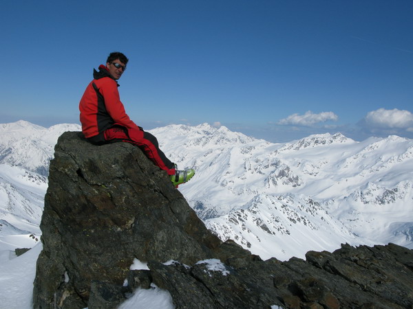 Pomyslím si. Som však spokojný. Veľmi spokojný. Podarila sa mi krásna túra. Nádherný ďeň! Príjemné pocity prevažujú, ani na tých snowbordistov sa už nehnevám. Šliapem na dnešnú deviatu trojtisícovku – Madritschspitze. Pásy som nalepil v pohode, zohrievam ich v zjazde na prsiach pod kombinézou. Aby som sa poistil, dal som si dole rukavice a sklznicu som očistil a nahrial holými rukami. Keby pásy nechytili, to by bol problém.