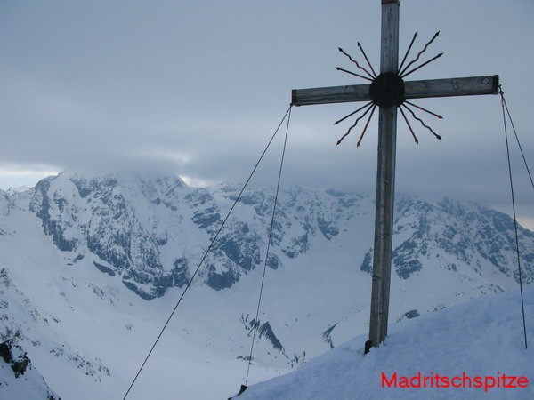Na vrchole fúka. Spravím rýchlo fotky, kľaknem si na lyže a aspoň trochu sa napijem. Počasie sa kazí, ale nie až tak, aby mi pokazilo plány. V zjazde je kôra, pripadám si ako ľadoborec nie ako lyžiar. Viditeľnosť pod mrakmi už nie je bohviečo. Strmým žlabom lyžujem ku zjazdovke, prichádzam do lyžiarskeho strediska Madritsch.