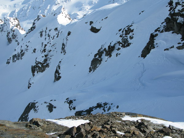 Pred vrcholom zbadám stopy vedúce do traverzu a zároveň stopu, ako niekto na lyžiach šliapal naspäť hore. Zvedavý prichádzam na vrchol, odopínam lyže a nakláňam sa zo skaly, aby som videl, čo sa tam stalo. Vzápätí zbadám lavínu v doline a v druhom momente vidím dlhý odtrh.