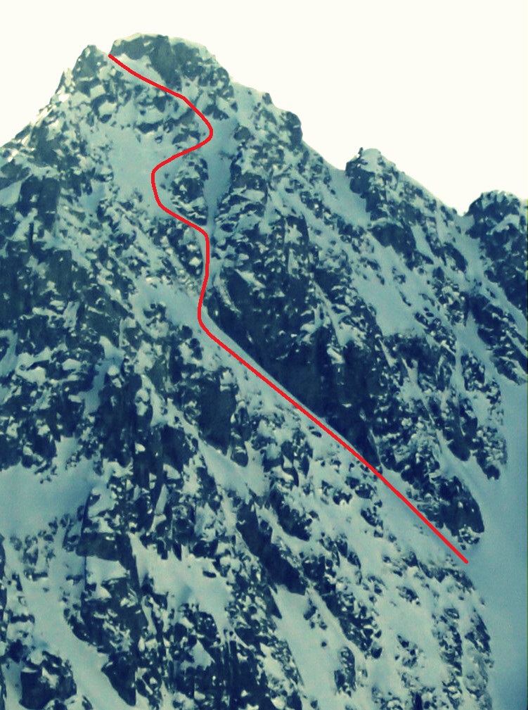 Sjezd lze zahájit opět až z úplného vrcholu. Prvních pár metrů na jih, potom už obrat na sever. Tím se objede horní skalka a už jsem na balkónku nad severní stěnou. Nepříliš strmá rampa mě dostává přímo do spádnice vrcholu, kde je něco jako žlab. Pár přesných oblouků a přichází traverz pod převislou věžičkou. Tam je potřeba si dát pozor, prosmýknout se pod ní a nezavadit o ni ramenem či batohem. Krátké sněhové pole mě navádí nad klíčové místo, uzoučký žlab. Cítím také expozici. Spousta vzduchu pod lyžemi. Měřáček od Piepsu ukazuje 51°. Hlavním problémem je ale šířka žlábku končícího malým skalním prahem. Každý přeskok/oblouk je potřeba přesně trefit a nikde nechytit patkou nebo špičkou. Tady opravdu není prostor na chybu! Přeskoky už dávám izolovaně, pěkně jeden po druhém. Potom s lyžemi na nohou ,,rozporem" špička-patka slézám asi metrový skalní práh. Skočit nejde, protože moc není kde brzdit. Tady opravdu chybí troška více sněhu...