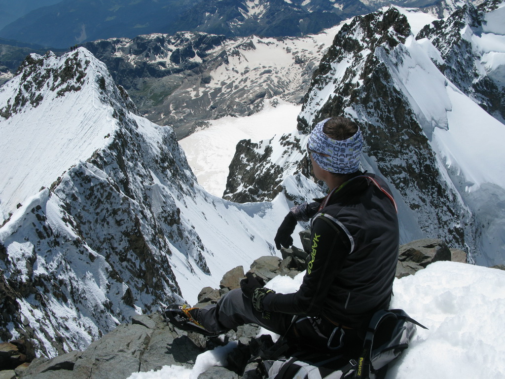 Počas tohto výstupu som vyrazil ráno o deviatej z hotela Roseggletscher 2000v.m. najprv na chatu Tschierva. Tu ma čakala časť výstroje. Nabalil som sa, prezul, dal si banán a vyrazil hore. Podmienky boli výborné, prvú zastávku pod sedlom Prievlusa som si dal mačky, sedačku, prezliekol tričko a po cca desiatich minútach pokračoval. Na Piz Bianco som dorazil po 2,5 hodinách od Tschiervy. Tu som si zas dal desť minút pauzu. Zjedol tyčinku a pozorujúc ľudí na hrebeni som si uvedomil že mám čas.
