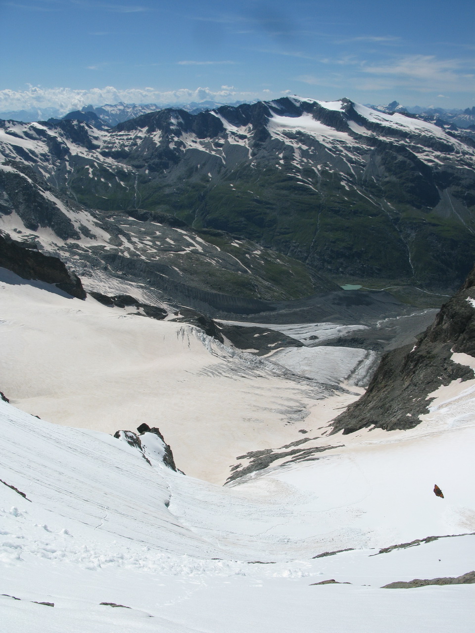 Biancograt - táto obľúbená túra bude túto sezónu ešte viac vyhľadávanejšia. Výstup na Matterhorn totiž značne skomplikuje kôli prestavbe zatvorená Hornli hutte. Toľko mi prezradil jeden známy horský vodca. Po dllhom období dažďa sa v posledných dňoch konečne vyčasilo a tak som dnes využil výborné počasie a bol som sa pozrieť aké sú podmienky na Biancograte. Túto túru totiž značne ovplyvňujú snehové podmienky a tak dokáže byť zakaždým úplne iná. Nebolo tomu ináč ani dnes. Snehové podmienky sú výborné. V stúpaní do sedla Prievlusa je veľa snehu, okrajová trhlina zasypaná, na Biancograte žiadny vodný ľad a aj cez záverečný kľúčový hrebeň som sa dostal v pohode. Viacej už z fotiek.