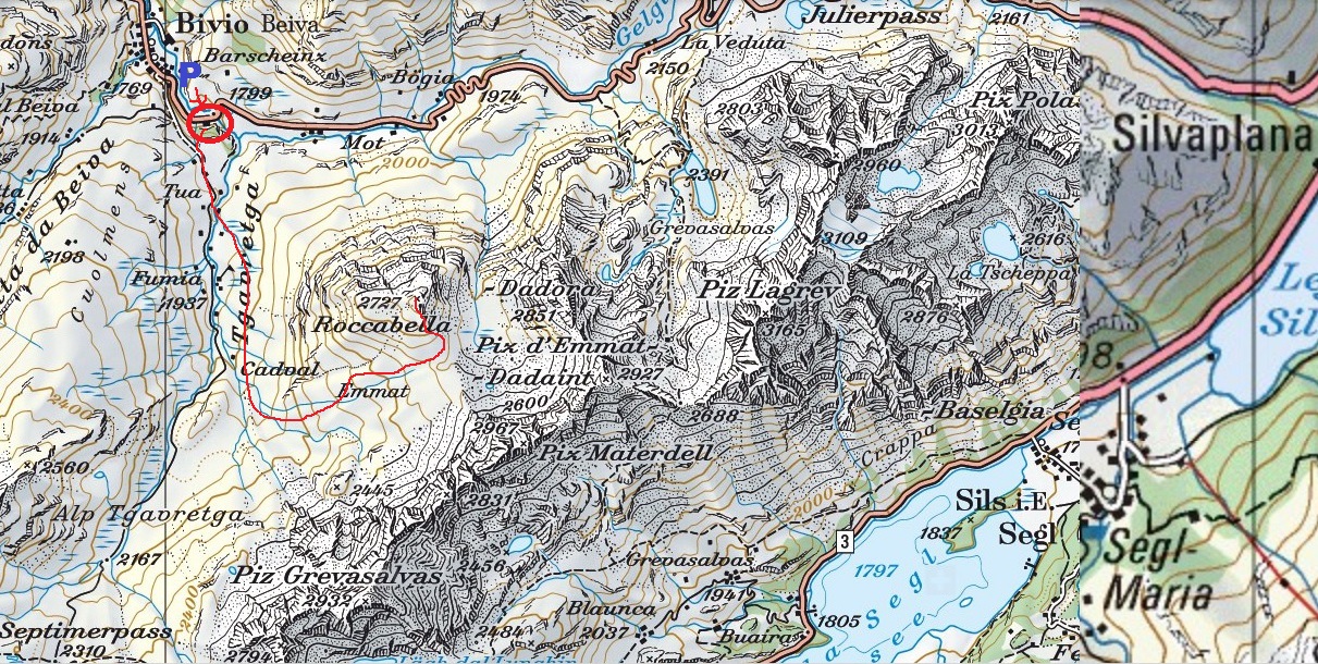 Kúsok smerom na sever z Julierpassu je malá horská osada Bivio s ešte menším lyžiarskym strediskom. Nie je tam ani jedna sedačka len kotvové vleky - skôr taký skiskanzen. V smere od Julierpassu ešte pred vjazdom do Bivia natrafíme na malé parkovisko, neplatí sa. Je tu odstavených pár Camperov s hrdým nápisom "Camping" na druhej strane cesty zase dolná stanica vleku s menšou drevenou reštauráciou.