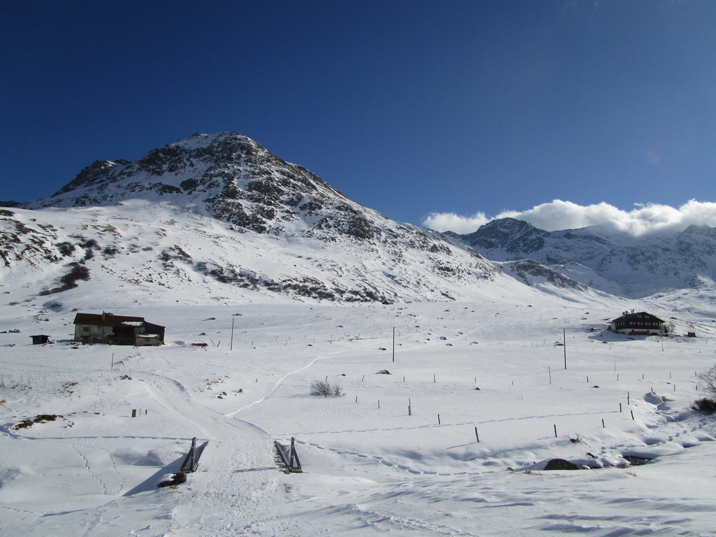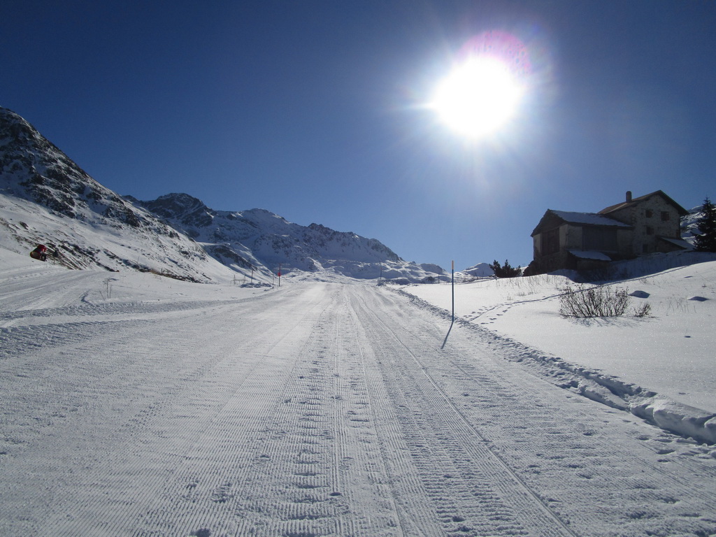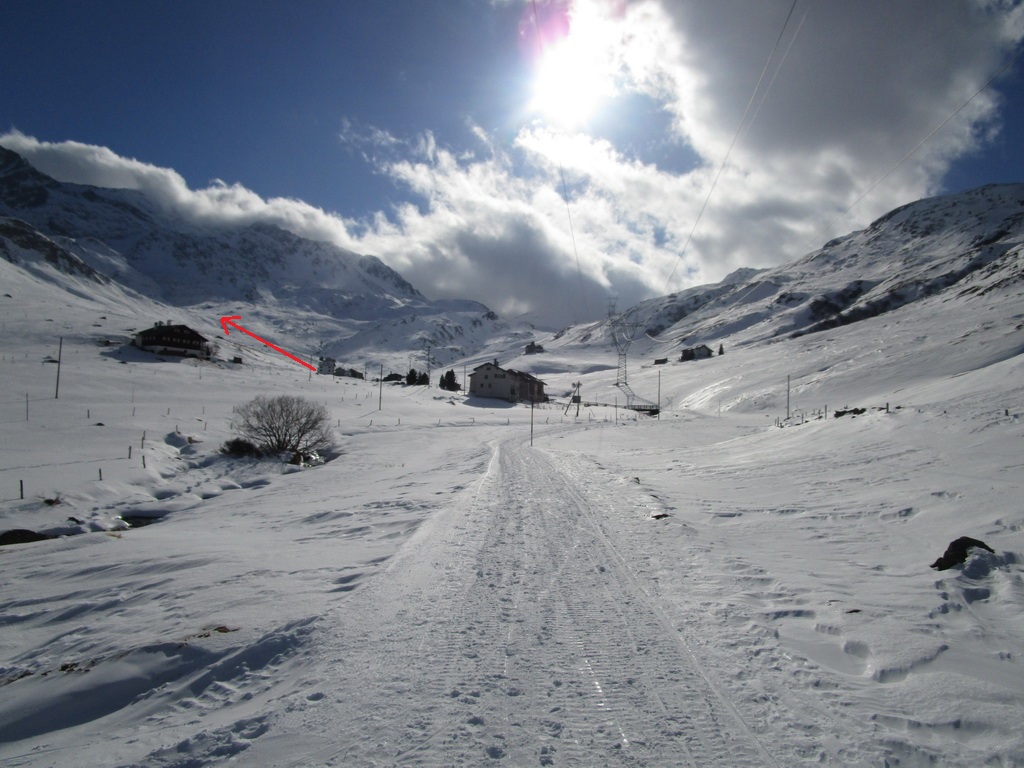 Parkujeme a vyrážame v snehovej biede najprv po poratrakovanej ceste smerom na Septimerpass. Pri prvých usadlostiach odbočujeme cez potok vľavo a po už predšlapanej stope po lúkach pomedzi kamene len mierne strmo vpred - ku našemu dnešnému cieľu: