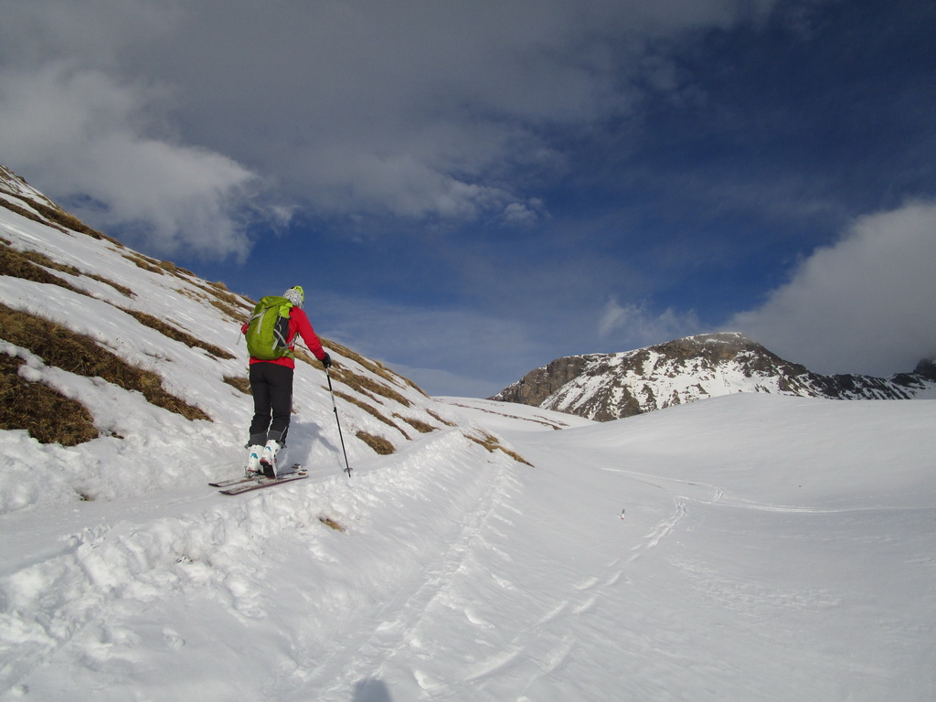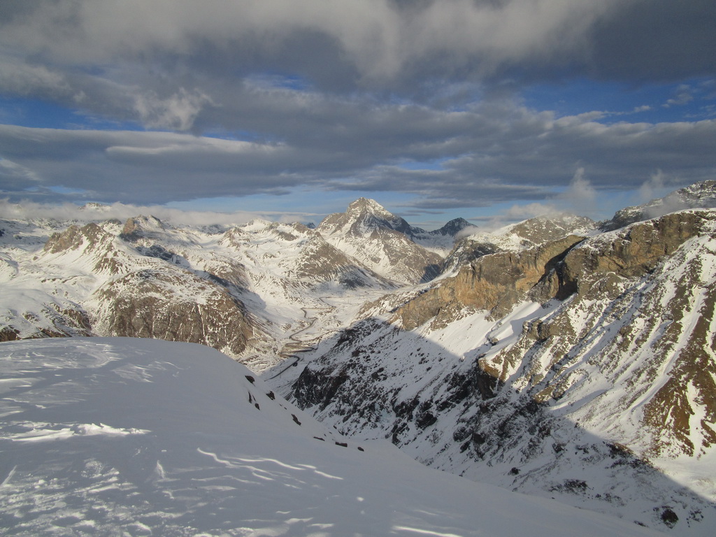 Tie však určite nepanujú v deň nášho výstupu. Po stope prichádzame do sedla. Obdivujeme výhľady na kopčeky ktorým kraľuje Lagrev, Grevasalvas, Coluonas, Piz Julier a kopec ďalších. Záver už miestami sneh vystrieda tráva, terén sa pristrmuje ale počasie aj napriek neskoršiemu času hovorí: "Choďte!"