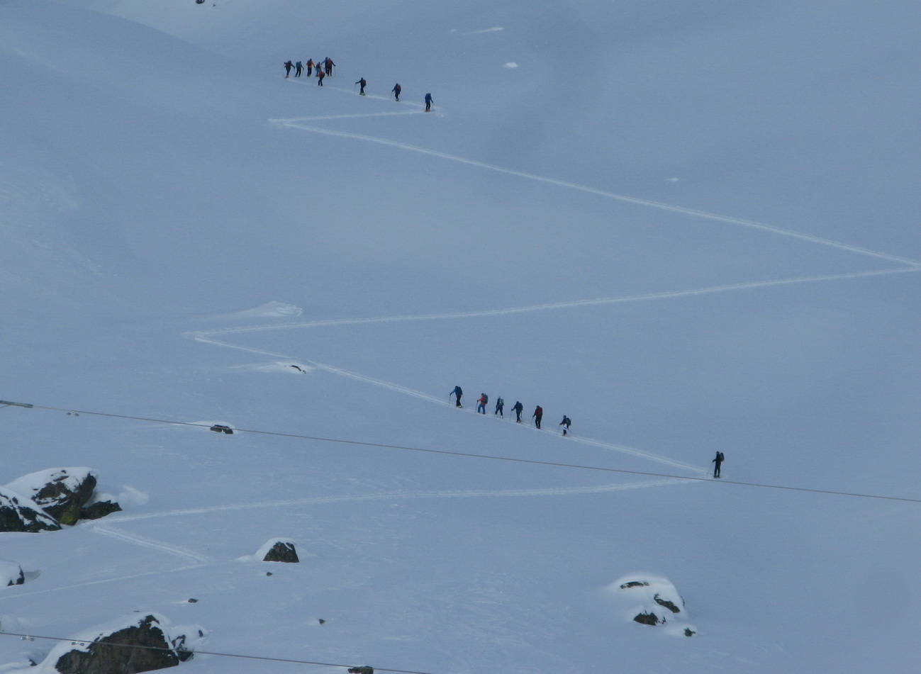 Hneď od parkoviska na mieste zvanom Alp Guglia sa začína terén dvíhať a stopa vedie popri veľkých balvanoch svahom hore. Nasleduje traverz vľavo, až prídete na úpätie Piz Polaschin a tu sa serpentínami stopa tlačí doprava hore. Pokračuje sa miernym chrbtom hore, až sa ocitnete v prostriedku kotlovitej doliny. Niečo tu chýba... Áno, z ľadovca už veľa neostalo, ale aj tak ten zvyšok tvorí prírodne chladenú zjazdovku, po ktorej sa dostanete až do sedla k malej meteorologickej stanici. Tu pre mnohých túra končí. Za dobrých podmienok sa dá pod sedielkom ísť viac vpravo na hrebeň a po ňom na vrchol. Aj podľa sprievodcu tu lyžiarska túra zvykne končiť. Po hrebeni sa však dá pokračovať ďalej. Pozor ale, všade sú nebezpečné preveje. Západná stena je vysoká a kolmá!