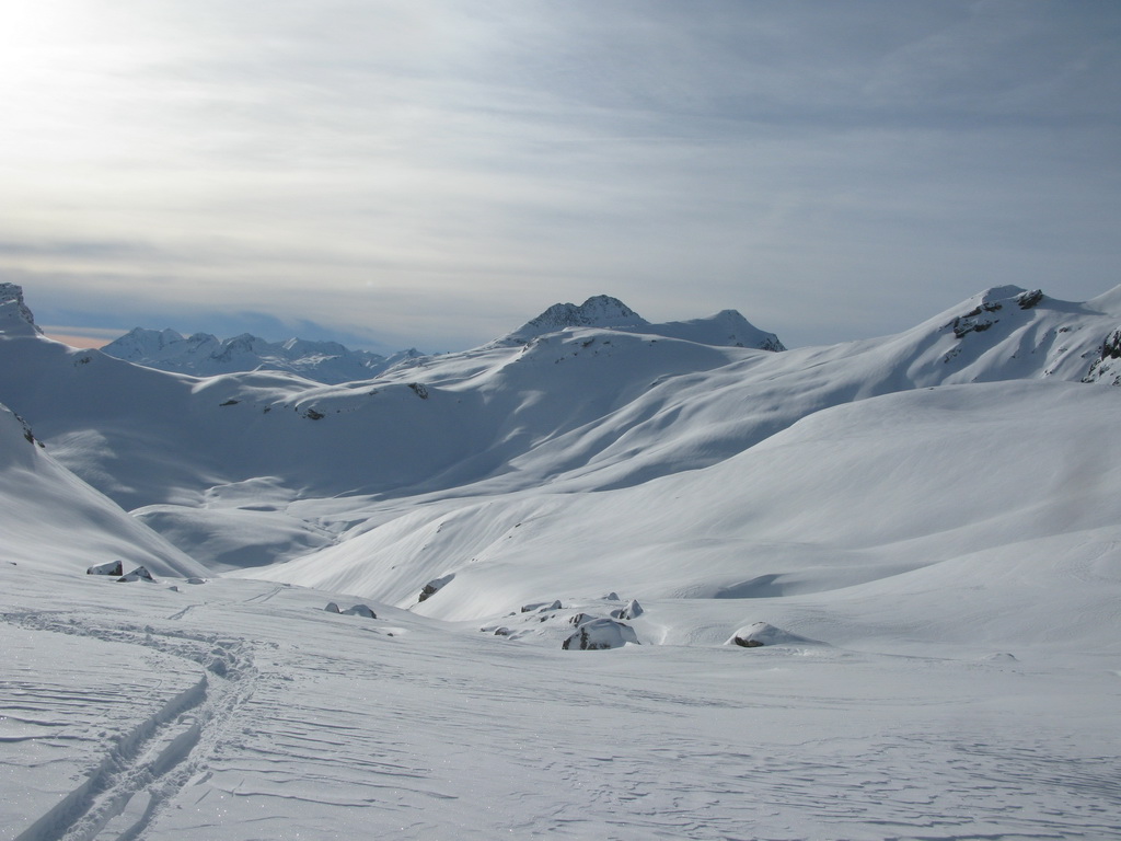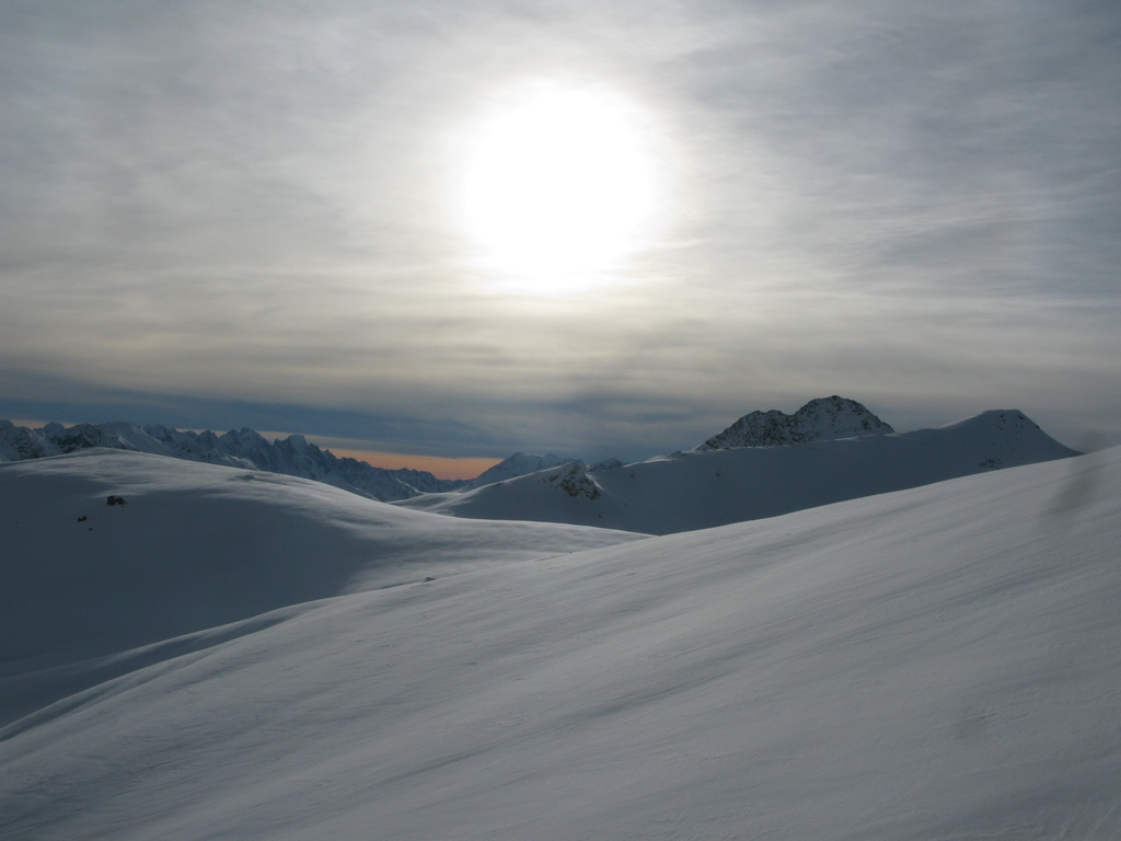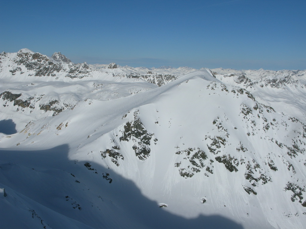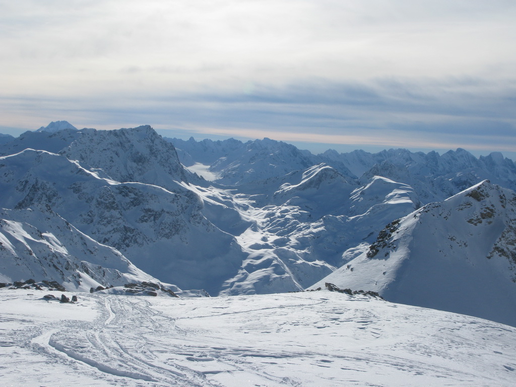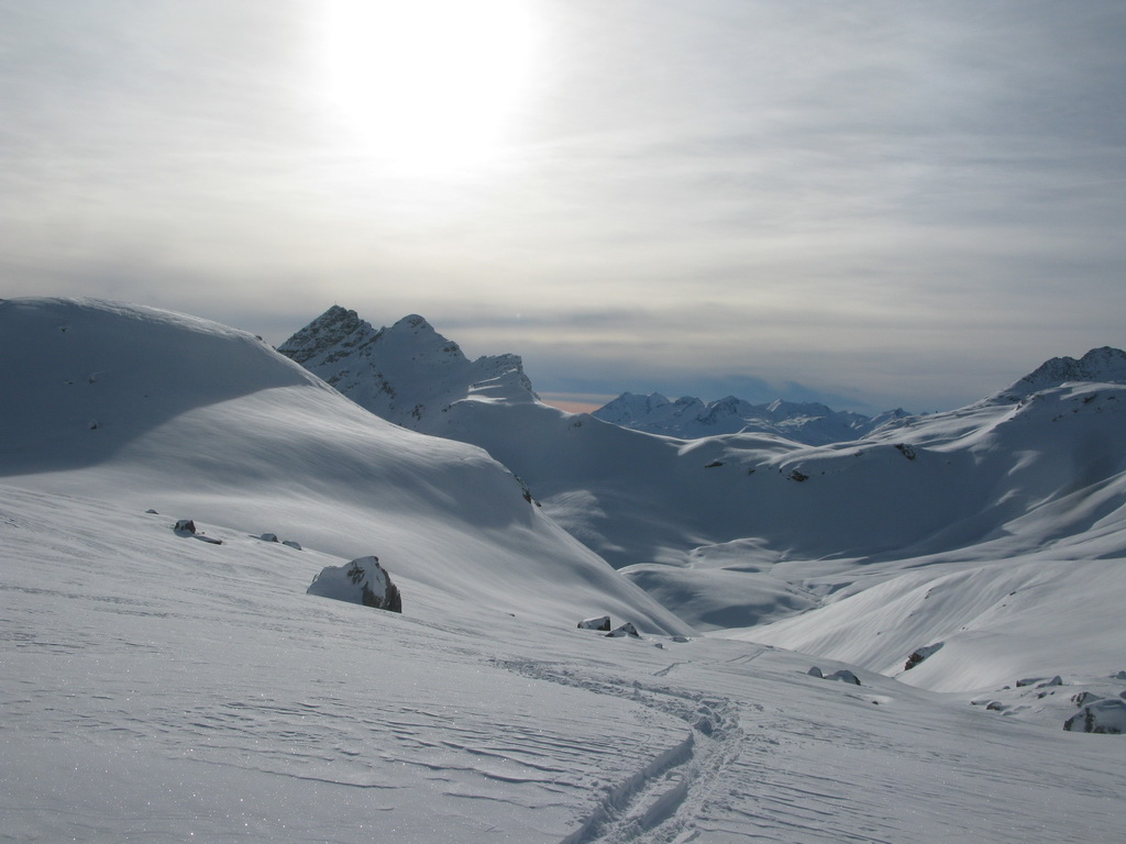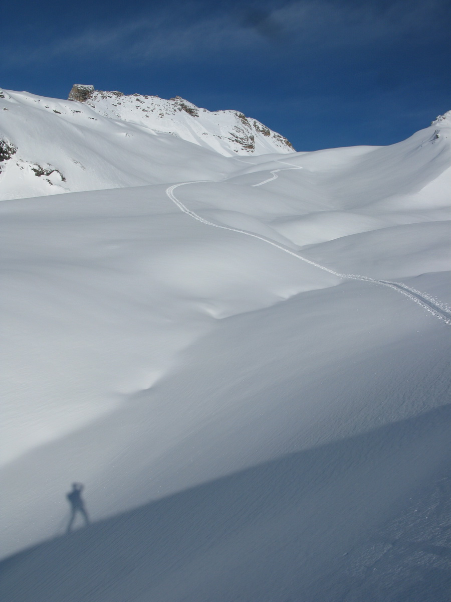 Čaká ma luxusná stopa vedúca terénom primeraného sklonu, max 30 stupňov. Na Piz Surgondu vychádzam v pohode, ani som si nepomyslel, že po tom snežení to bude také ľahké. Keďže také pekné dni zásadne končím až večer, ešte pridávam výšľap na trochu nižší, krásny skialpový kopček Piz Compagnung. Tu už šliapem stopu svahom zase nepresahujúcim 35 stupňov sklonu. Všade masy nového snehu. Rovnako ako aj minulý rok sa na tomto mieste zachytilo najviac a najkvalitnejšieho prachu. Slnko sem moc nesvieti.