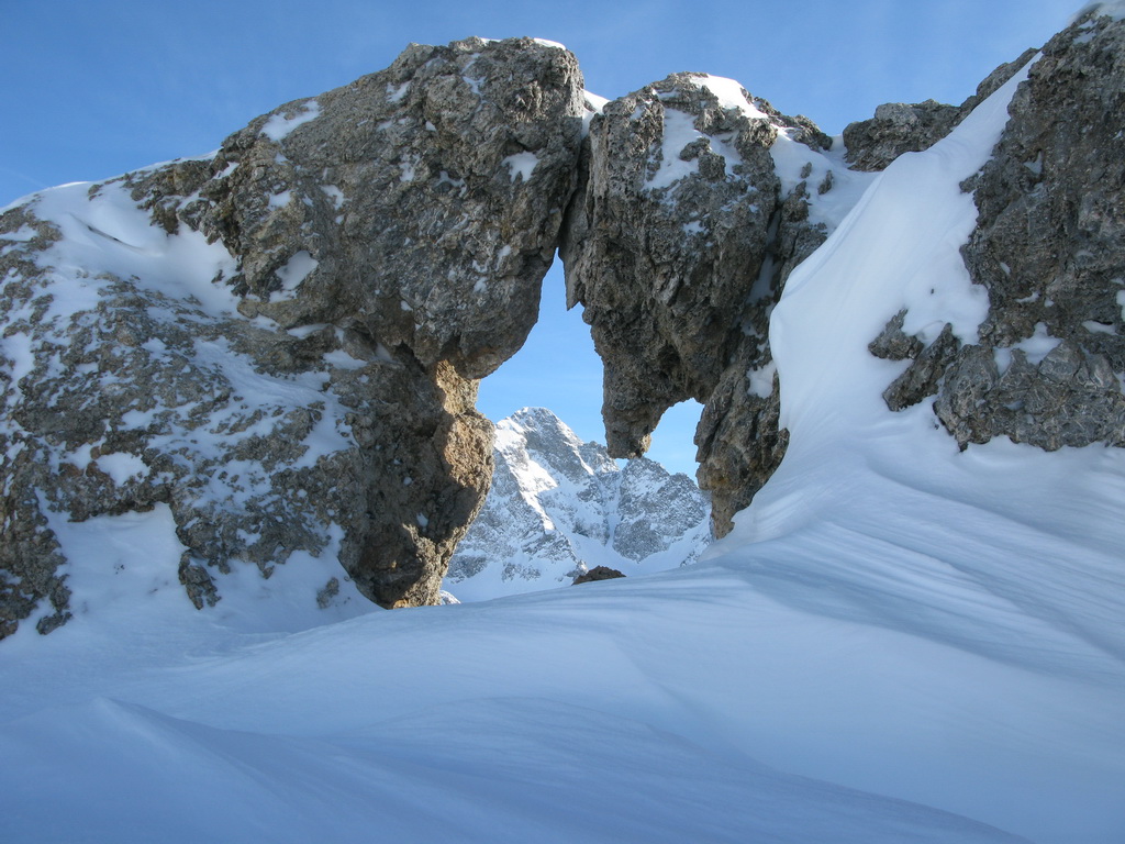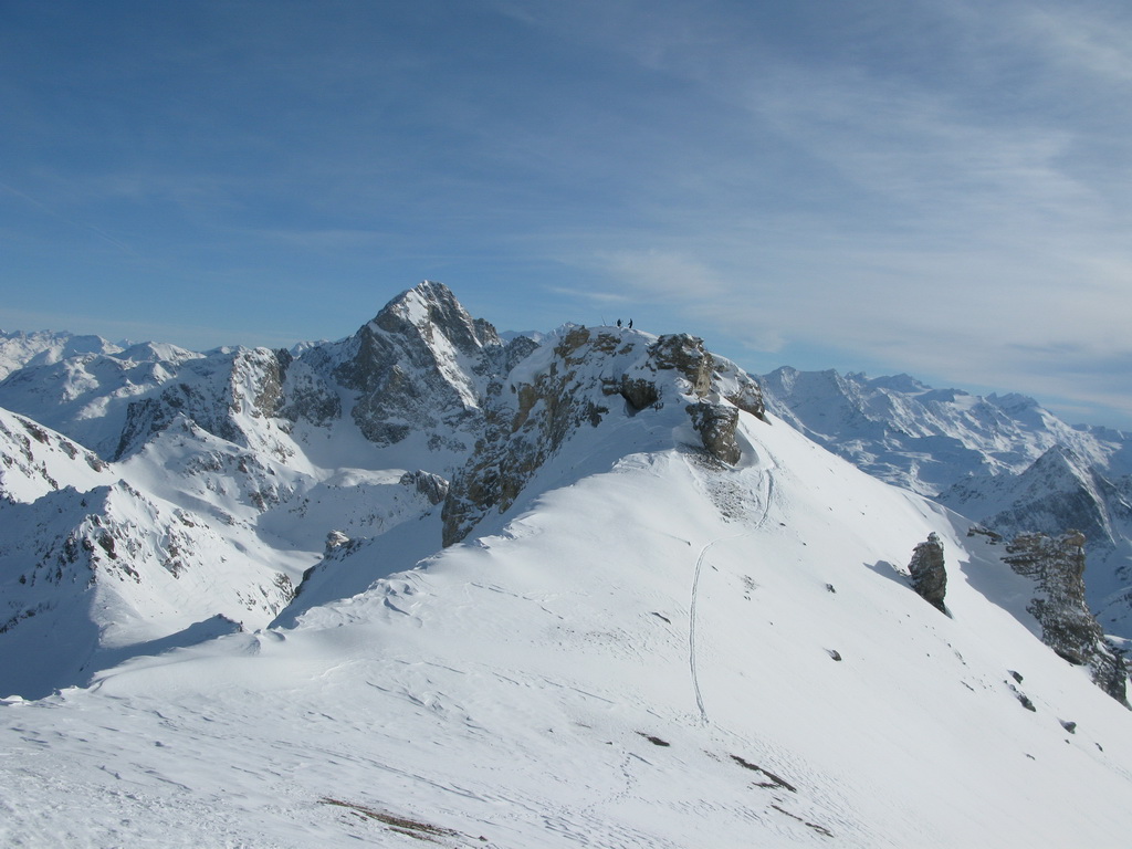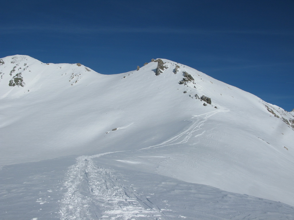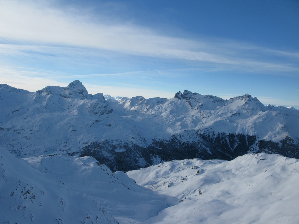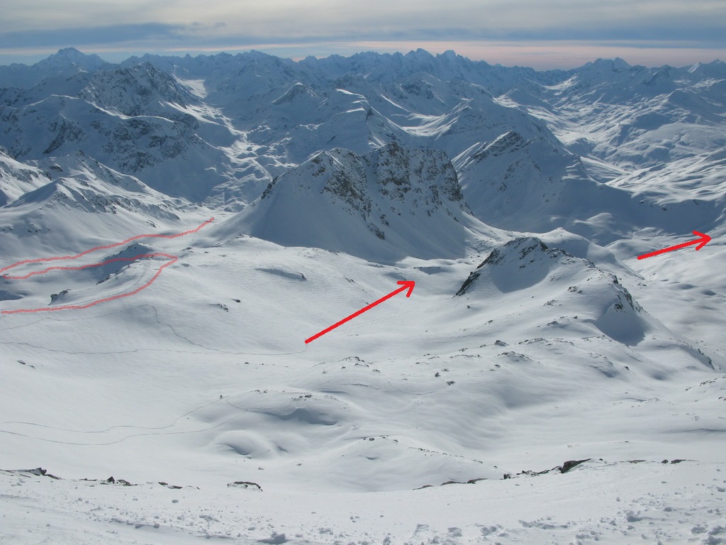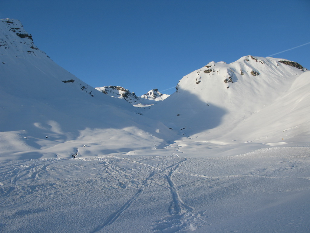 Čaká ma luxusná stopa vedúca terénom primeraného sklonu, max 30 stupňov. Na Piz Surgondu vychádzam v pohode, ani som si nepomyslel, že po tom snežení to bude také ľahké. Keďže také pekné dni zásadne končím až večer, ešte pridávam výšľap na trochu nižší, krásny skialpový kopček Piz Compagnung. Tu už šliapem stopu svahom zase nepresahujúcim 35 stupňov sklonu. Všade masy nového snehu. Rovnako ako aj minulý rok sa na tomto mieste zachytilo najviac a najkvalitnejšieho prachu. Slnko sem moc nesvieti.