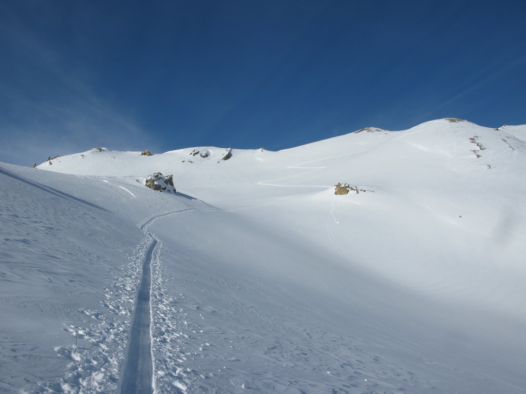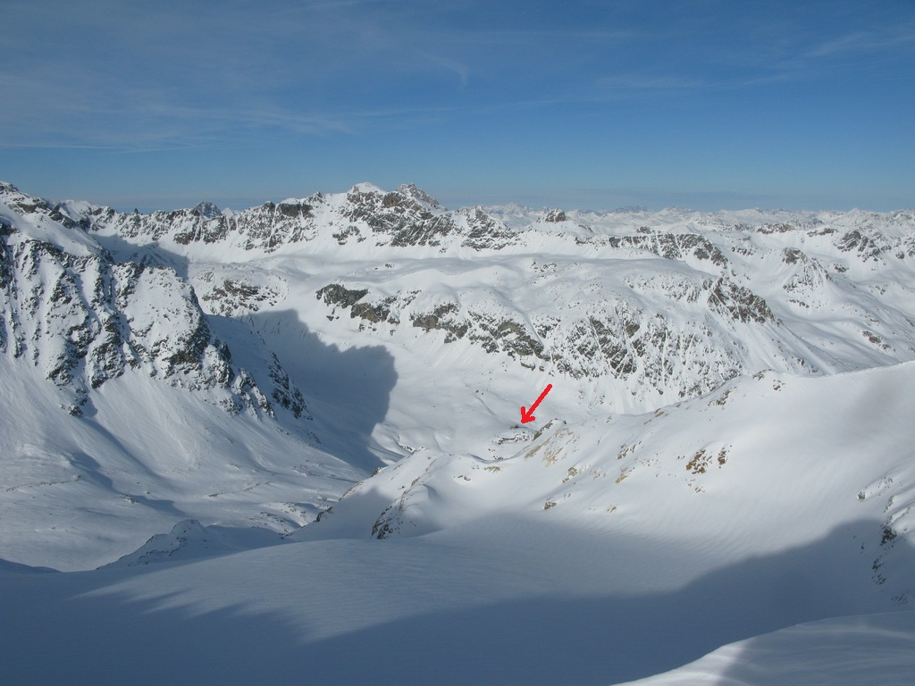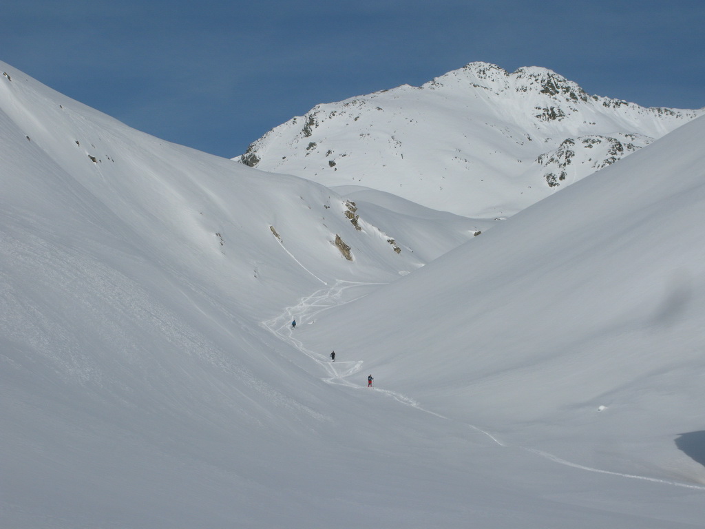 Po dramatickom snežení v posledných dňoch sa hneď deň po skončení sneženia spravilo krásne počasie. Podľa všetkej správnosti by sa deň po takom besnení živlov určite nemalo ísť na lyžiarsku túru a ak, tak len mierne svahy. A také sa dajú nájsť presne v oblasti Julierpassu. Už z auta vidím parkovisko asi s piatimi autami a stopu cik-cakujúcu nad parkoviskom hore. Prvé auto na parkovisku patrí horskému vodcovi. Toto som presne potreboval, pomyslím si. Vyrážam cca o jedenástej.