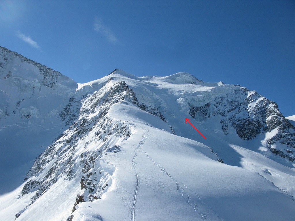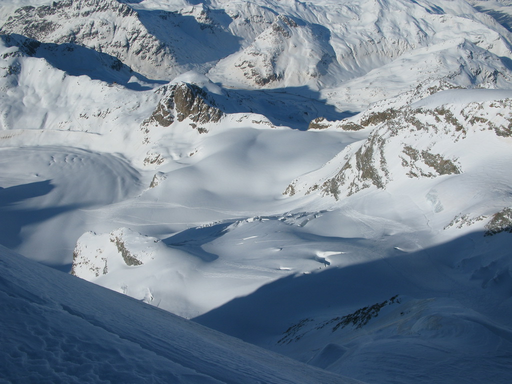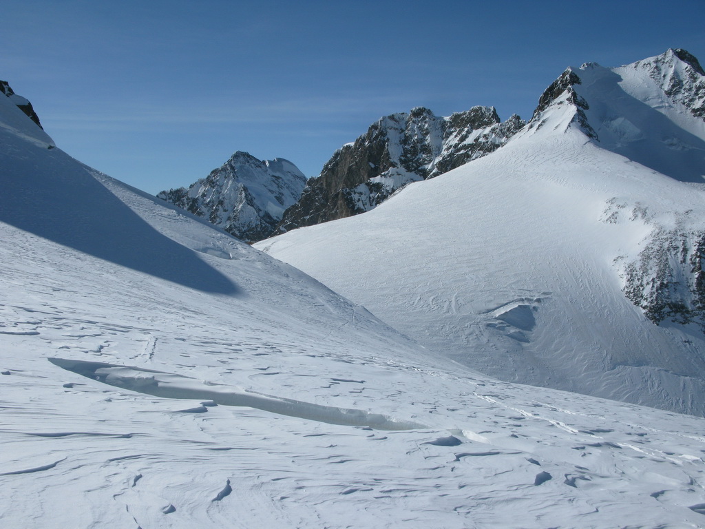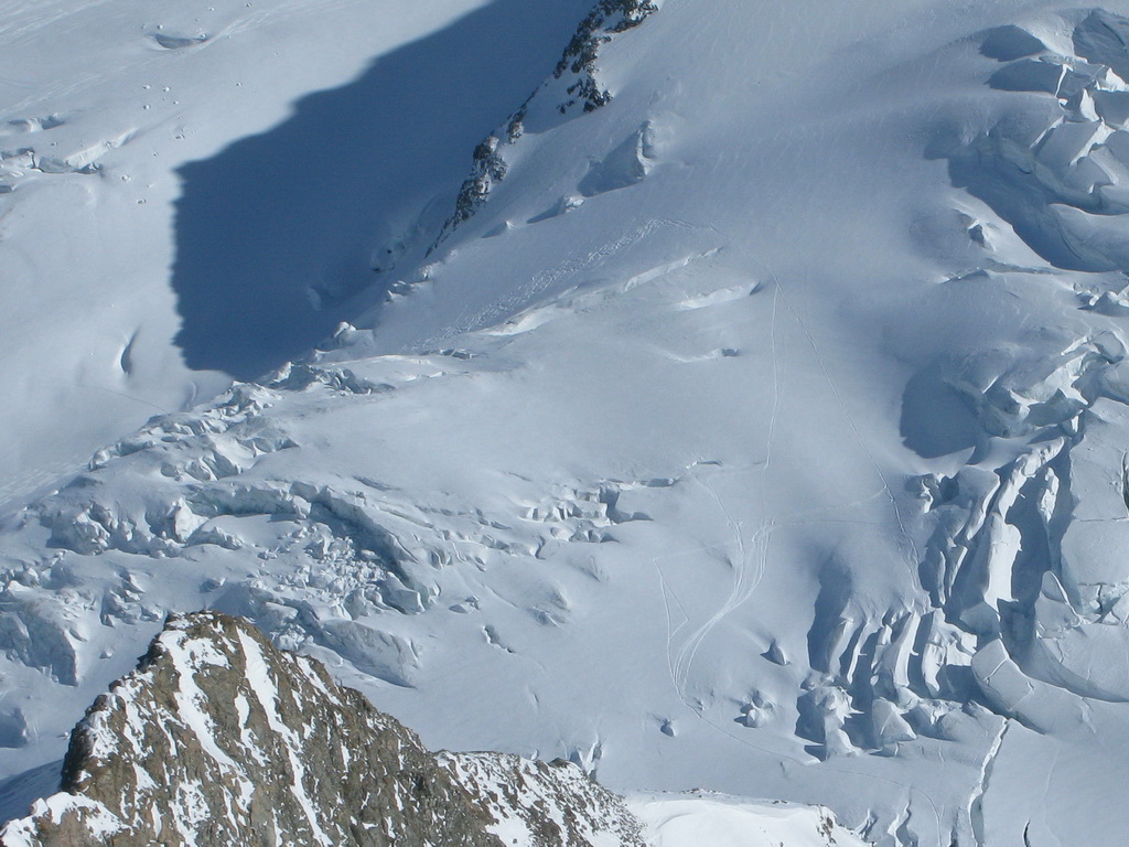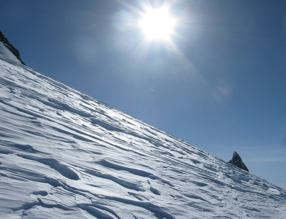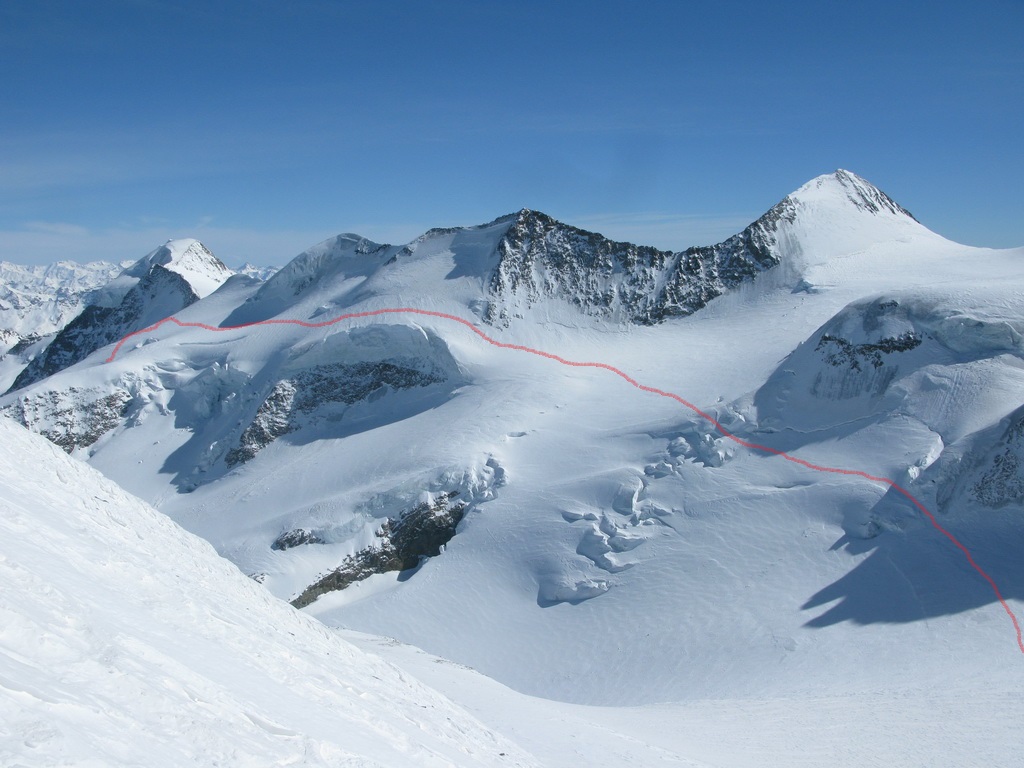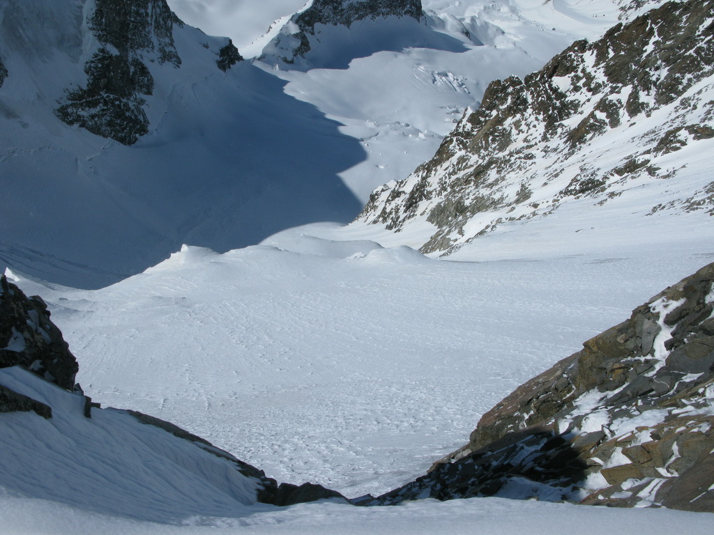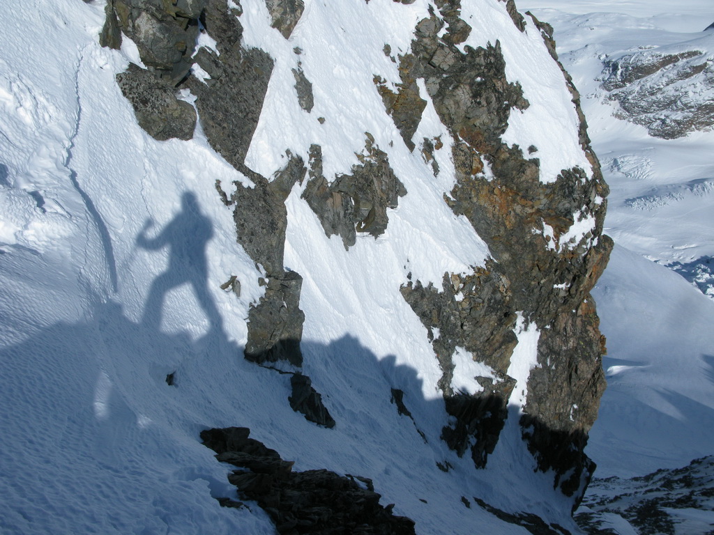 Pokračujem ďalej po hrebeni, až po skalný hrebeň. V lete sa postupuje ním, obtiažnosť cca 2+. Stopy pod skalami však odbočujú doprava - strmým traverzom a zjazdom na pásoch sa dostávam pod ľadovcový kuloár. Ten je vďaka množstvu snehu v strede zjazdný a dá sa ním dokonca vyjsť aj hore na pásoch. Počas tohto výšľapu prechádzam po niekoľkých zasnežených trhlinách. V závere stopa traverzuje vľavo, obíde trhliny a zatočí doprava na traverz Bellavisty. Sneh je vyfúkaný od silného vetra do známych vlniek. Je tvrdo a stopa sa začína strácať.