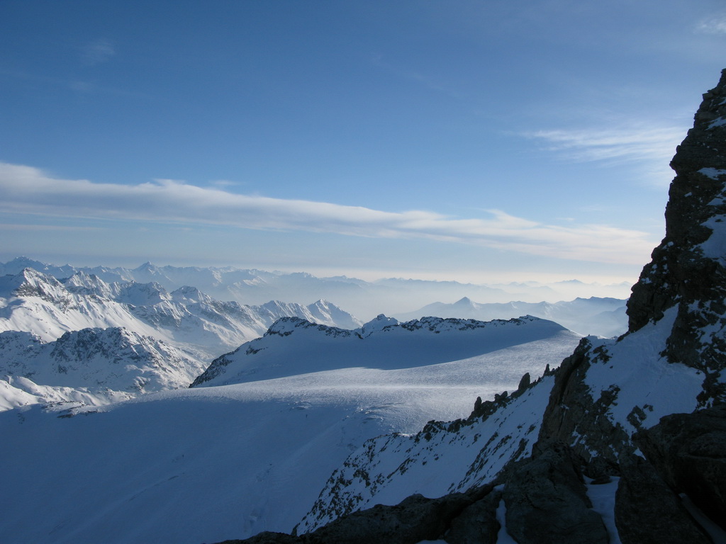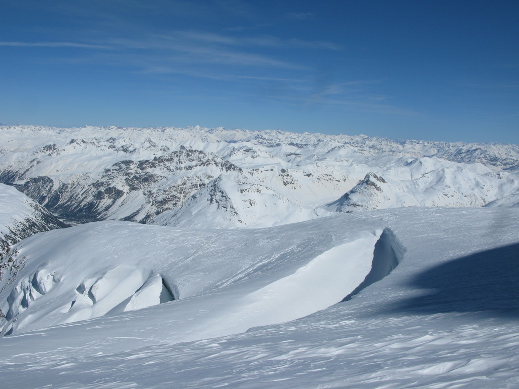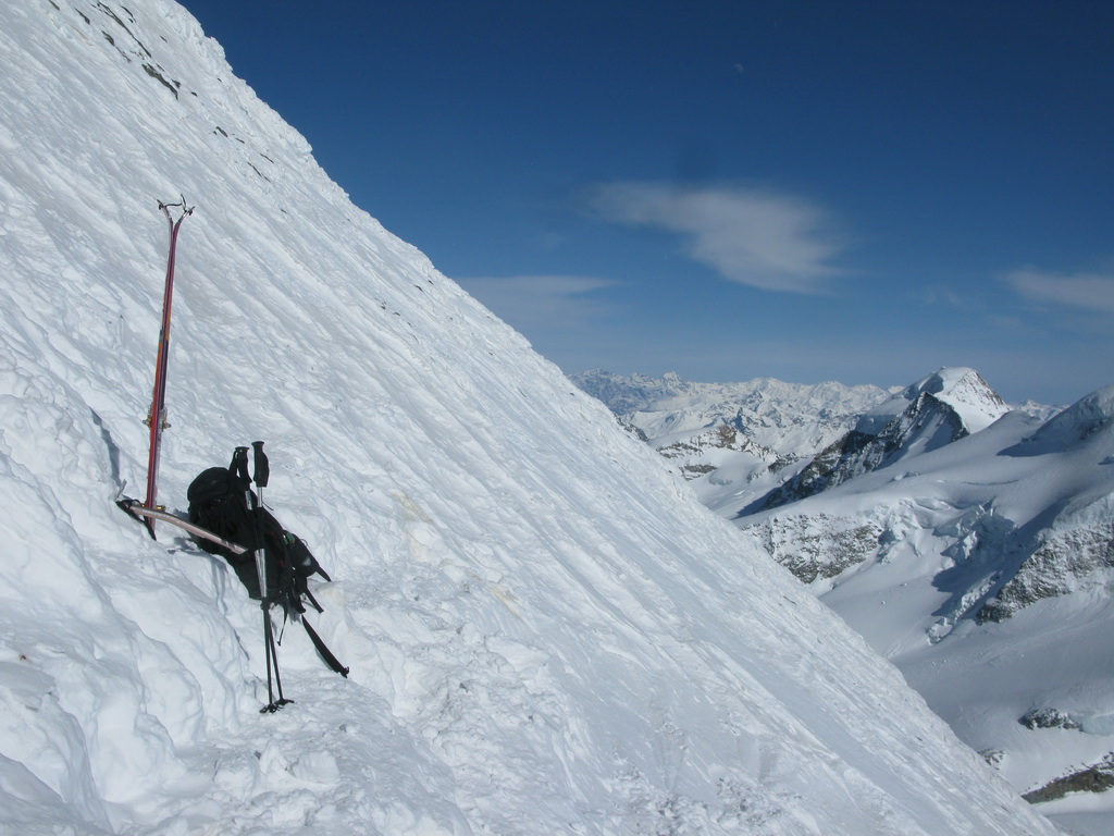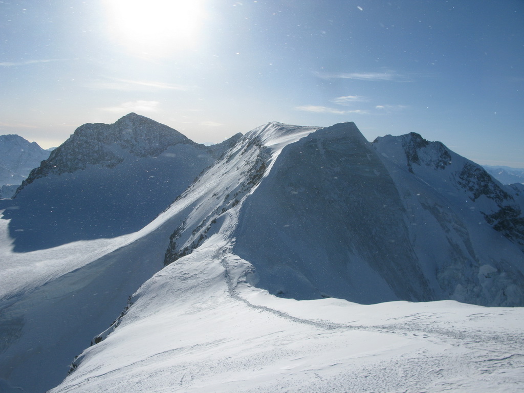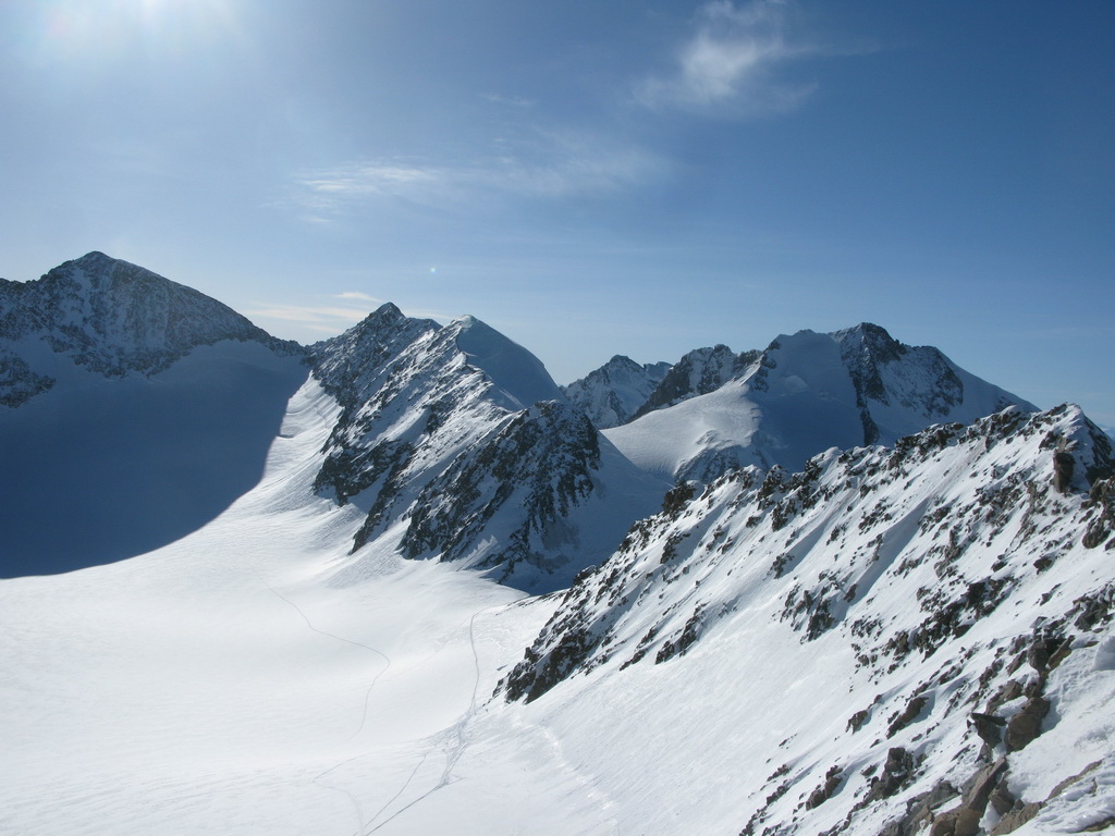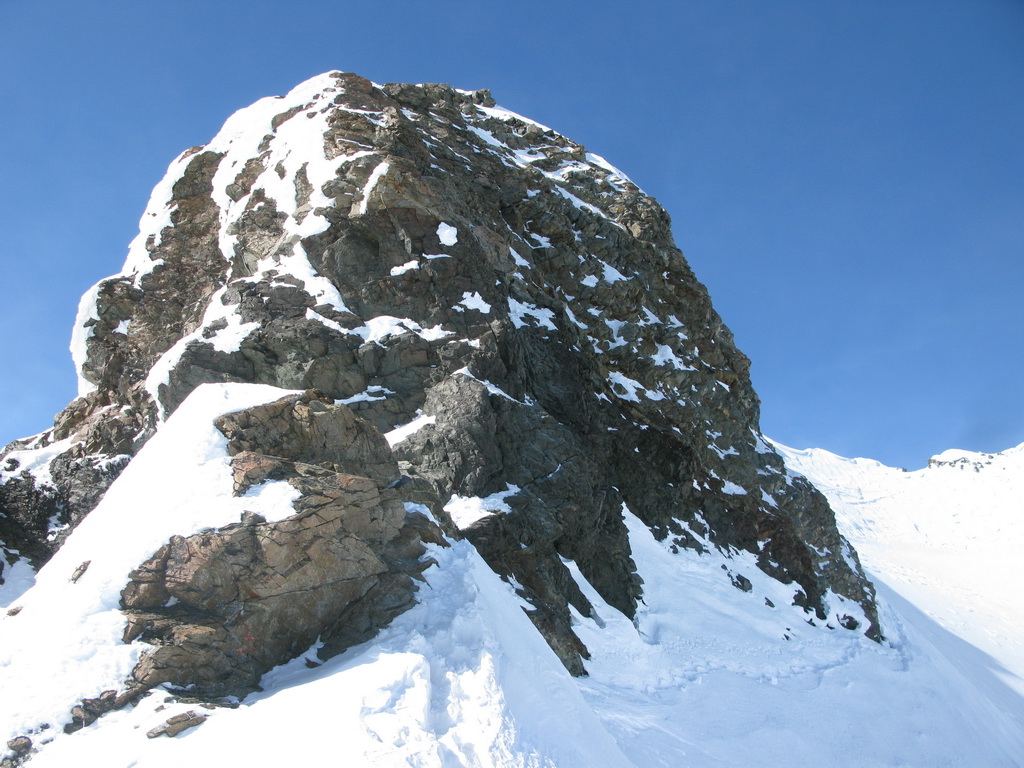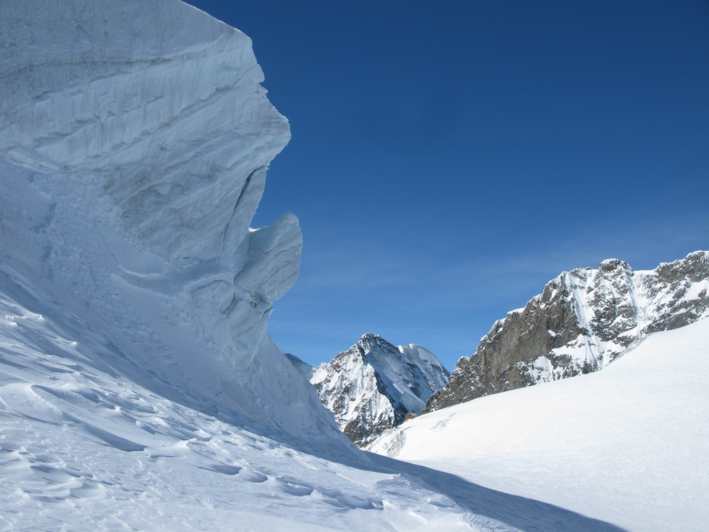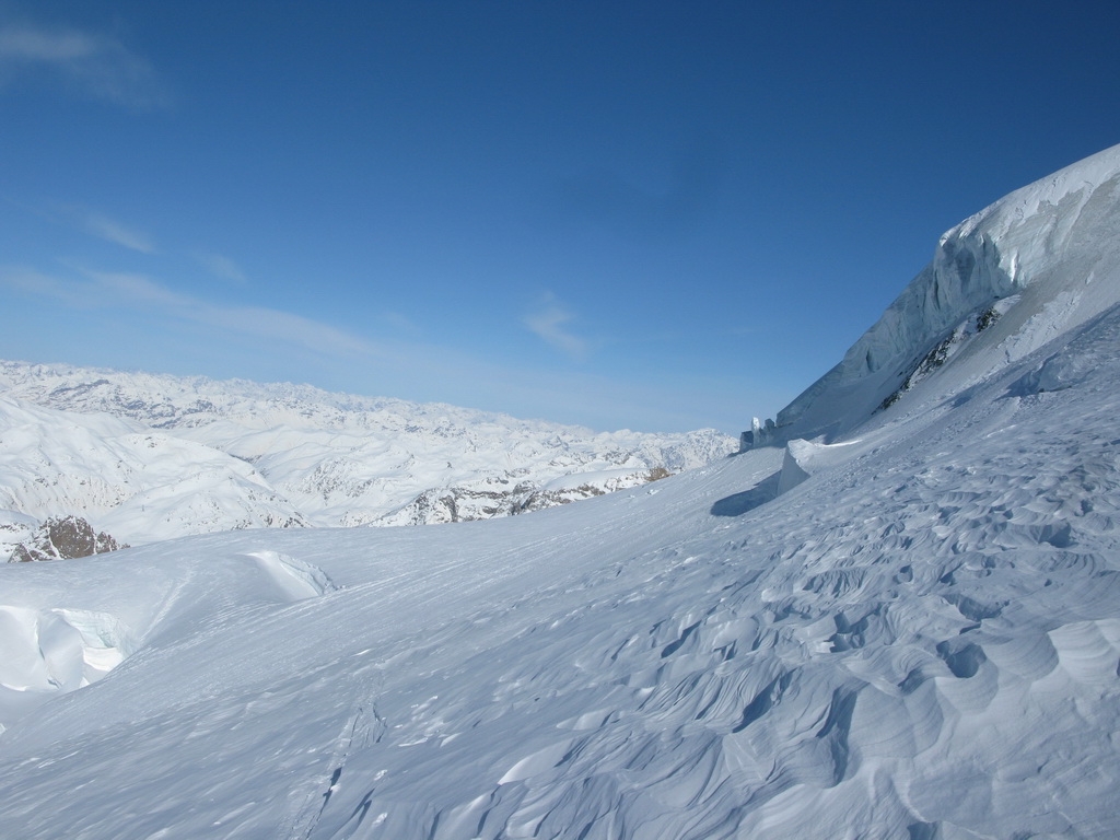 Pokračujem ďalej po hrebeni, až po skalný hrebeň. V lete sa postupuje ním, obtiažnosť cca 2+. Stopy pod skalami však odbočujú doprava - strmým traverzom a zjazdom na pásoch sa dostávam pod ľadovcový kuloár. Ten je vďaka množstvu snehu v strede zjazdný a dá sa ním dokonca vyjsť aj hore na pásoch. Počas tohto výšľapu prechádzam po niekoľkých zasnežených trhlinách. V závere stopa traverzuje vľavo, obíde trhliny a zatočí doprava na traverz Bellavisty. Sneh je vyfúkaný od silného vetra do známych vlniek. Je tvrdo a stopa sa začína strácať.