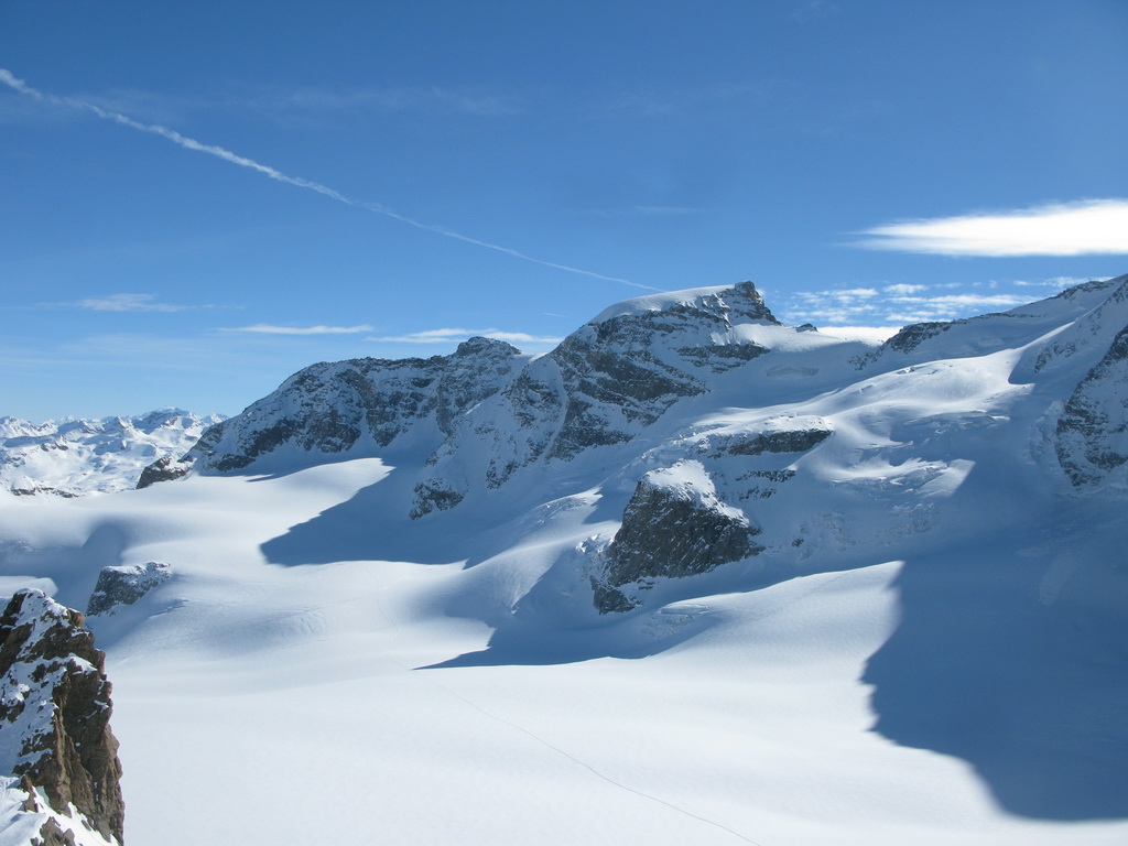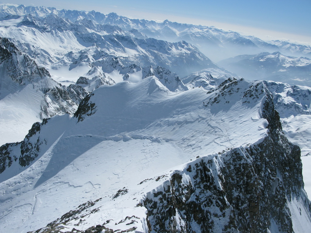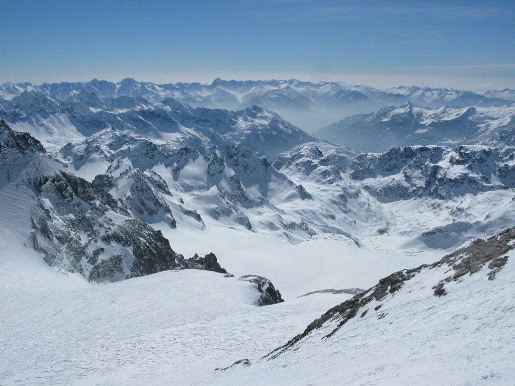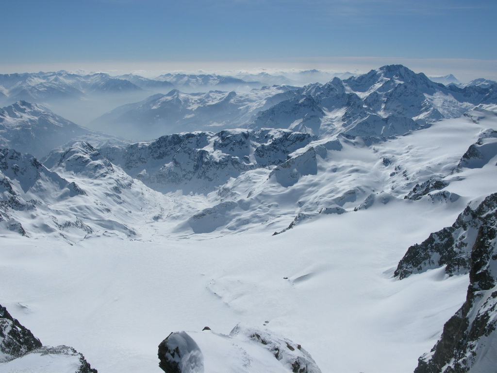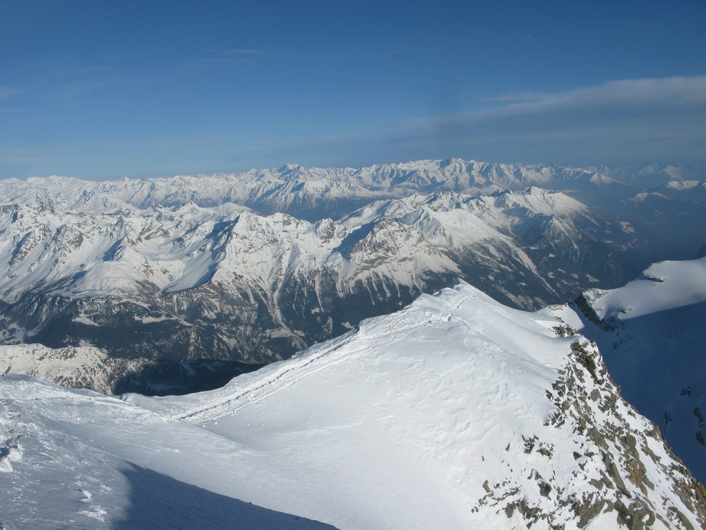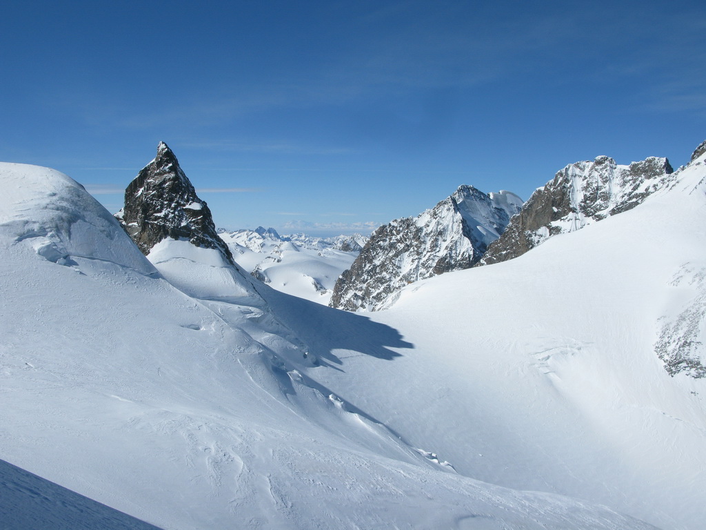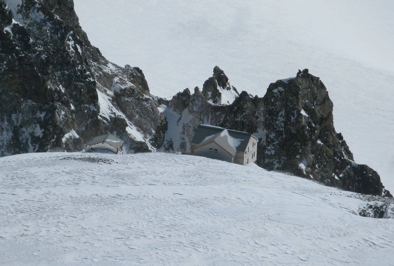 Pokračujem ďalej po hrebeni, až po skalný hrebeň. V lete sa postupuje ním, obtiažnosť cca 2+. Stopy pod skalami však odbočujú doprava - strmým traverzom a zjazdom na pásoch sa dostávam pod ľadovcový kuloár. Ten je vďaka množstvu snehu v strede zjazdný a dá sa ním dokonca vyjsť aj hore na pásoch. Počas tohto výšľapu prechádzam po niekoľkých zasnežených trhlinách. V závere stopa traverzuje vľavo, obíde trhliny a zatočí doprava na traverz Bellavisty. Sneh je vyfúkaný od silného vetra do známych vlniek. Je tvrdo a stopa sa začína strácať.