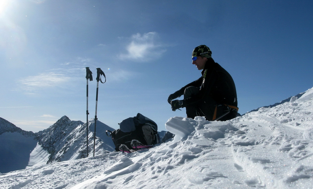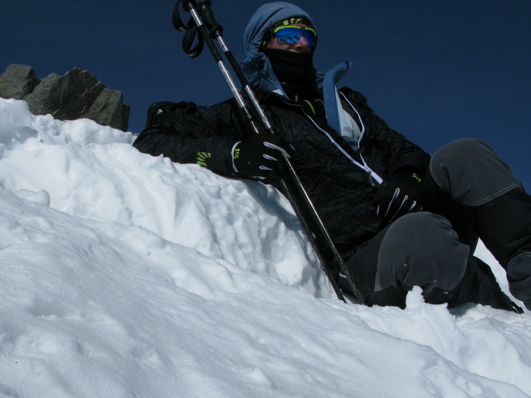 Po návrate z vrcholu do skidepa sa rozhodujem čo ďalej. Rovno dole sa nechystám. Aj keď väčšina by sa uspokojila s pekným vrcholom, ja mám na dnes ešte ďalšie plány. Vzhľadom na pokročilý čas aj únavu a aj nepriaznivé snehové podmienky vo výškach ich ale musím zredukovať.