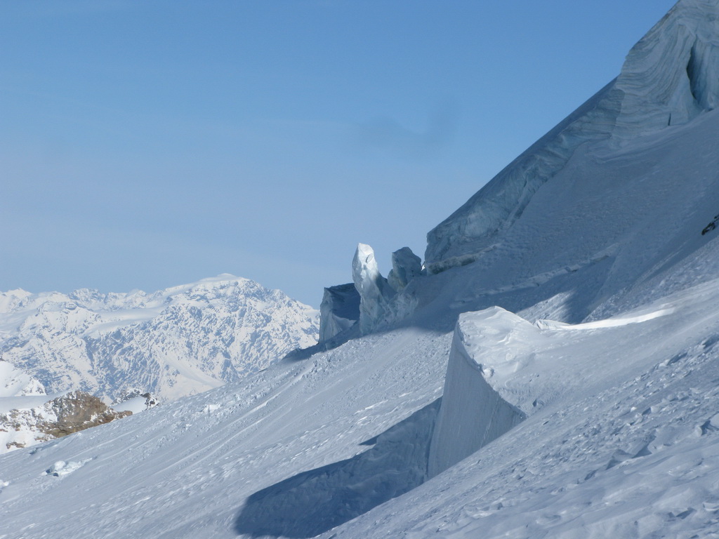 Pri hľadaní správneho smeru sa ocitám chvíľu dokonca na okraji séraku, hneď však utekám späť hore do bezpečnej vzdialenosti. Nechcel by som sa tu ocitnúť v zlej viditeľnosti. Našťastie je už pár dní stabilné počasie. Nachádzam stopu, teda len nepatrné zárezy v tvrdom snehu, a traverzujem po nej. Neviem či je správna a z traverzu nevidieť smerom dole. Traverzujem na pásoch ľadový svah, beriem cepín do ruky. Nasleduje adrenalínový zjazd na pásoch a dostávam sa na biele plató. Som z traverzu preč, bola to správna stopa.