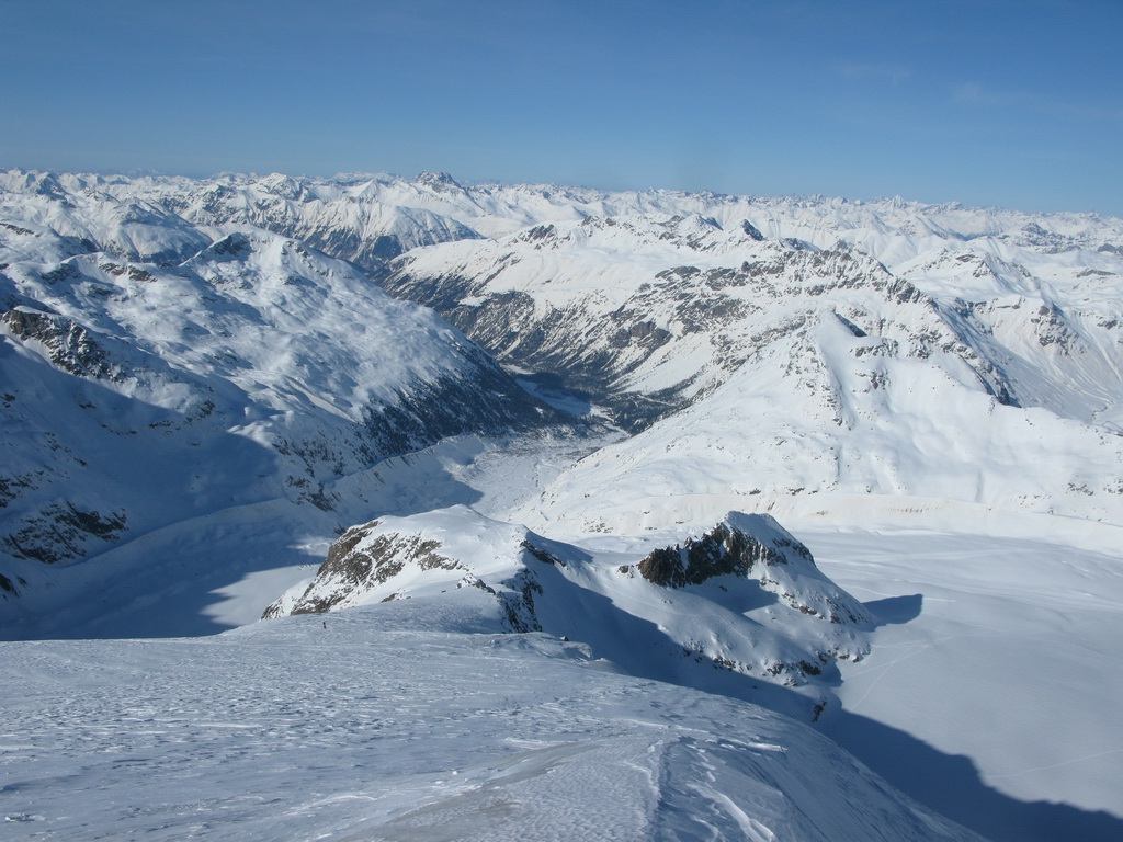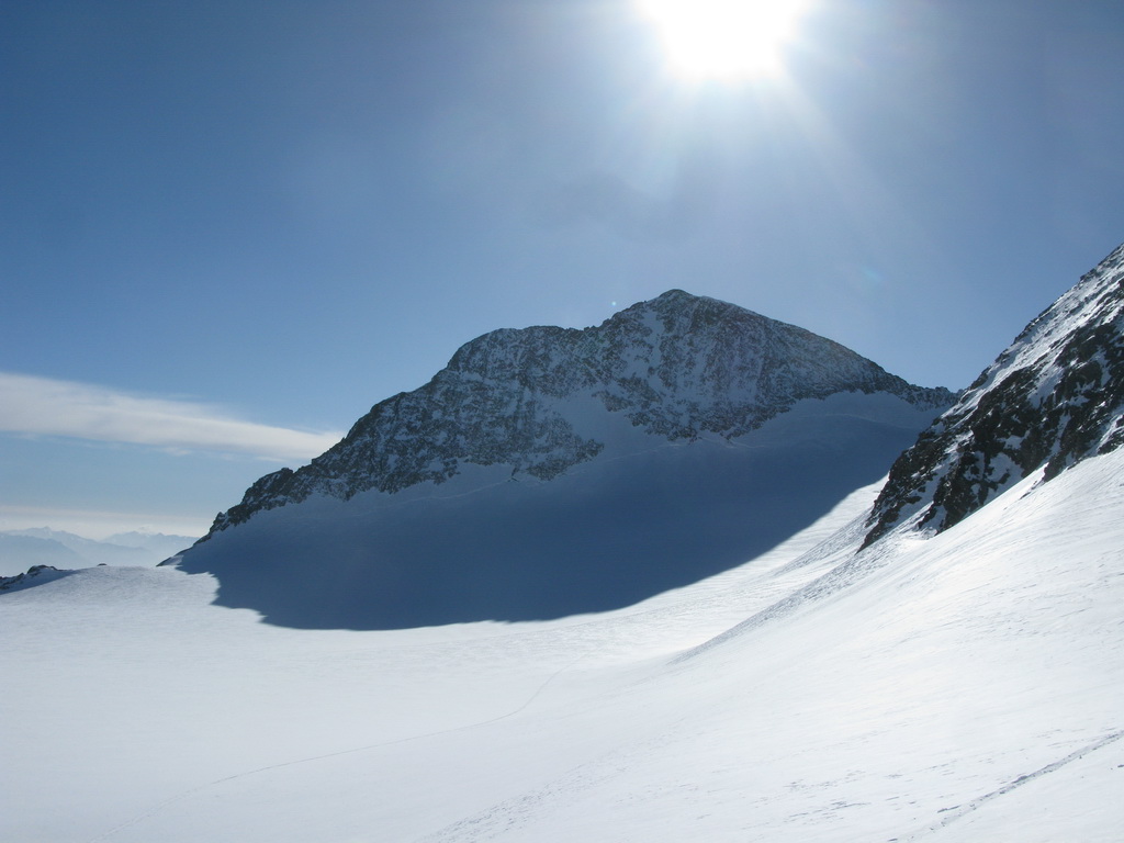 Z Diavolezzy vedie dole ľadovcom neupravovaný frírajdový zjazd, označený tyčami. Vzhľadom na už pár dní trvajúce pekné počasie je to tu pojazdené a ja stúpam hore po ujazdenej zjazdovke. Pozorujem stopy vedúce z Buuchu a aj stopy z Fortezzy. Nakoniec sa rozhodnem obísť Fortezzu zľava a využiť mierne a pohodlné stúpanie ľadovcom. Aj slnko, na ktoré sa takto dostávam oveľa skôr, tu zohralo svoju úlohu.