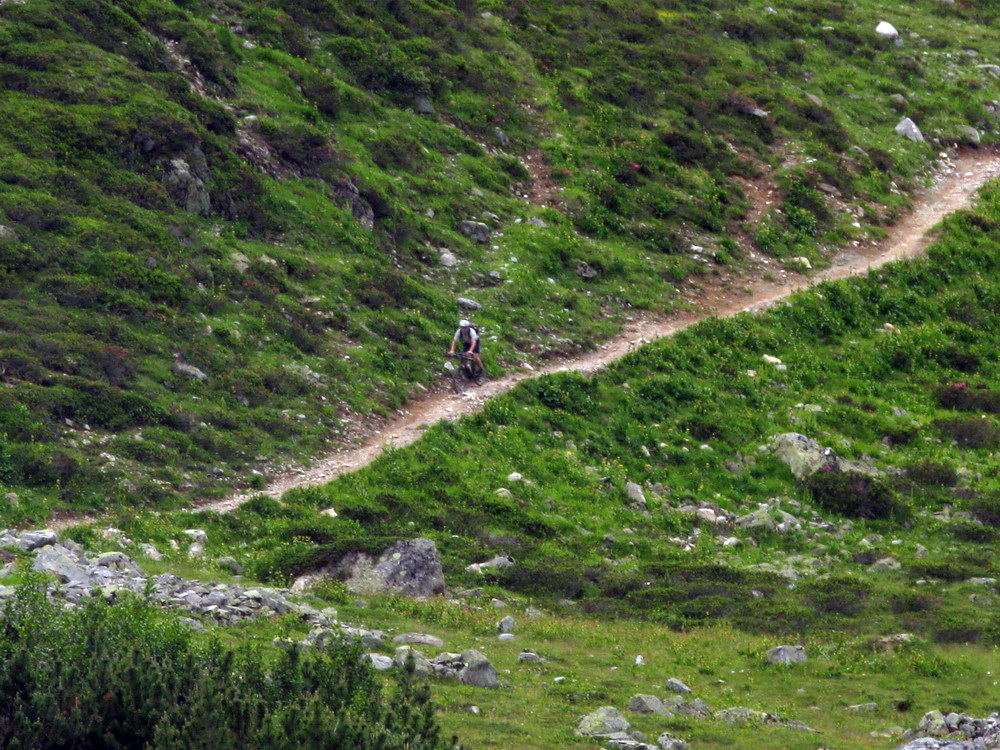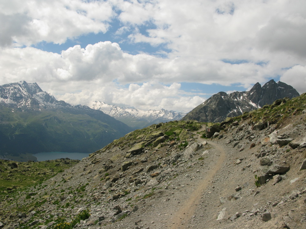 Mal som už nejaké informácie, podrobnú mapku singlov k tomu (je k dostaniu zdarma), a tak som si naplánoval a uskutočnil okruh cez Celerinu, serpentínami cez lyžiarske stredisko až k passo Suvretta. Zaujímavosťou bol už krásny traverz a zjazd do sedla. Tu sa už bajker dostáva pomaly mimo civilizáciu a umožní mu to práve krásny singlík, vytesaný miestami aj v žulovom suťovisku.