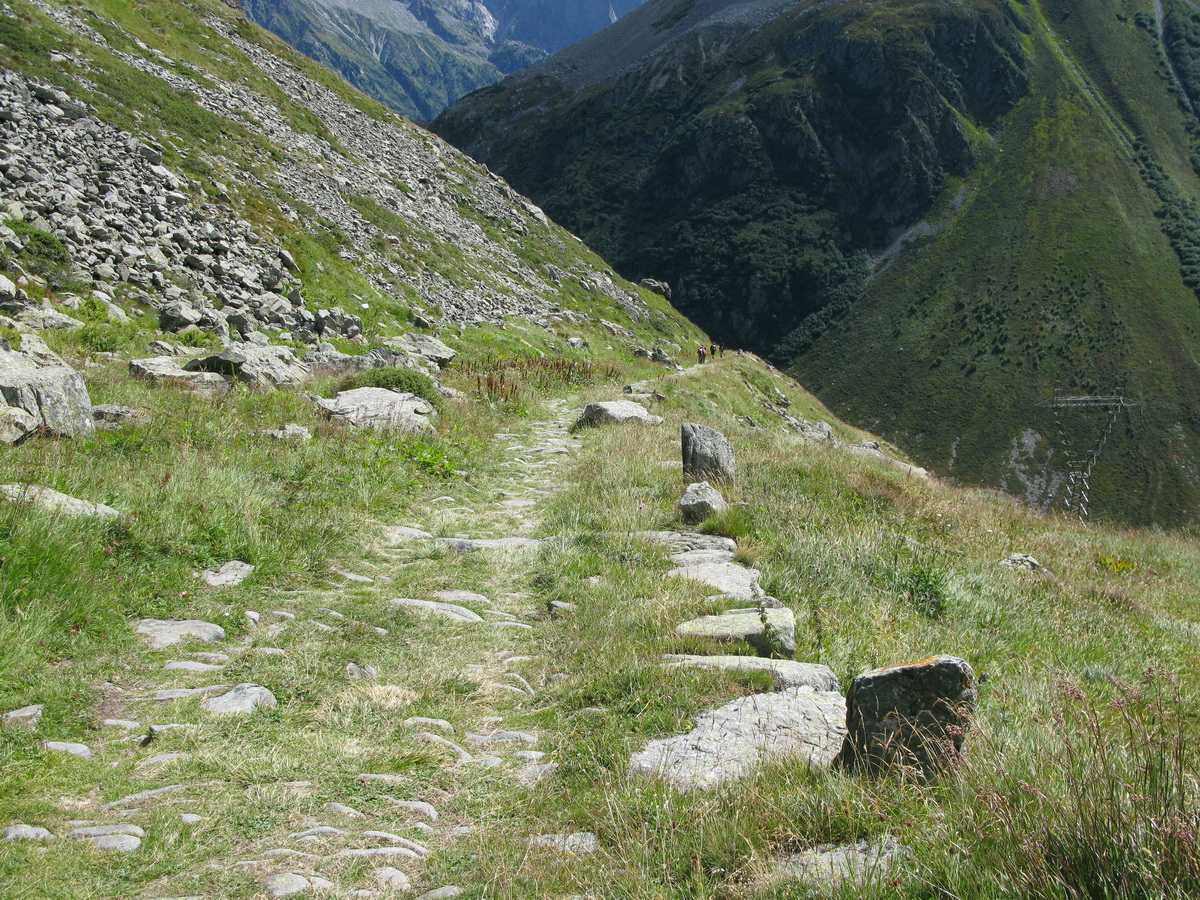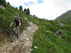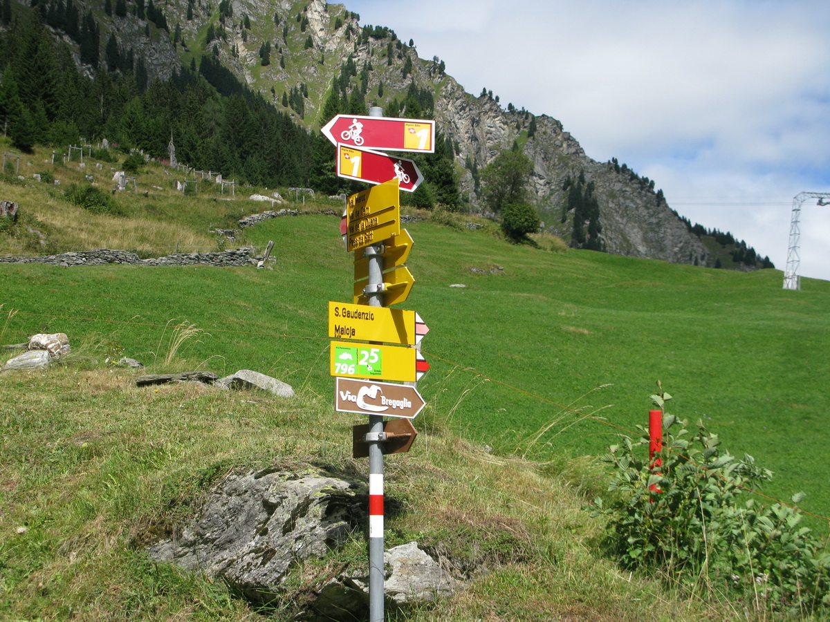 Do sedla som sa dostal pohodlne v sedle. Pofotil som pekné výhľady a šup ho dole. Už zakrátko sa cestička zmenila na pekný a miestami aj ťažký singlzjazd. Paráda!! V závere ostré serpentíny vydláždené kameňmi, to už bolo na hrane a veru som aj párkrát zosadnúť musel. Nad dedinkou Casaccia odbočka doľava na značenú cyklotrasu ušetrí výškové metre. Pri starom kostole som sa napojil na asfaltku a nasledovali serpentíny na passo Maloja (1818m). Hore som vyšiel v celkom zachovalom stave, a tak som si ešte vyrazil oťuknúť začiatok doliny Val Forno.