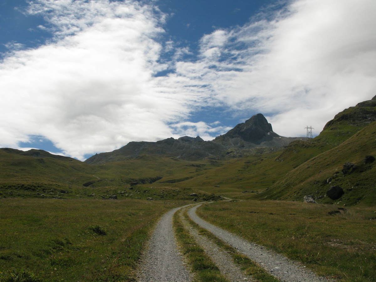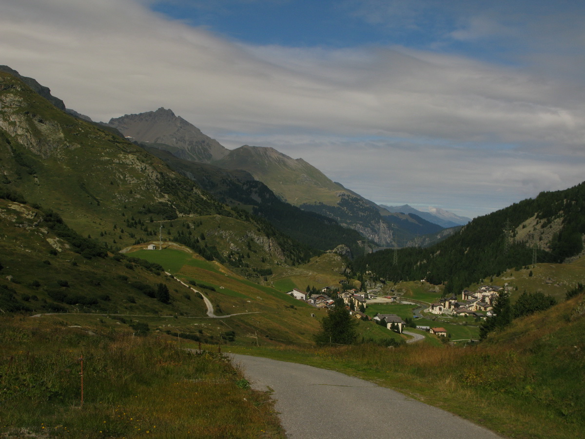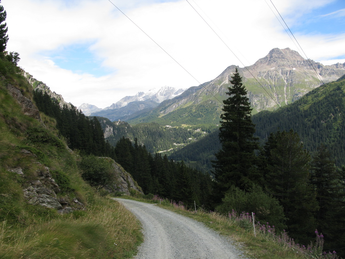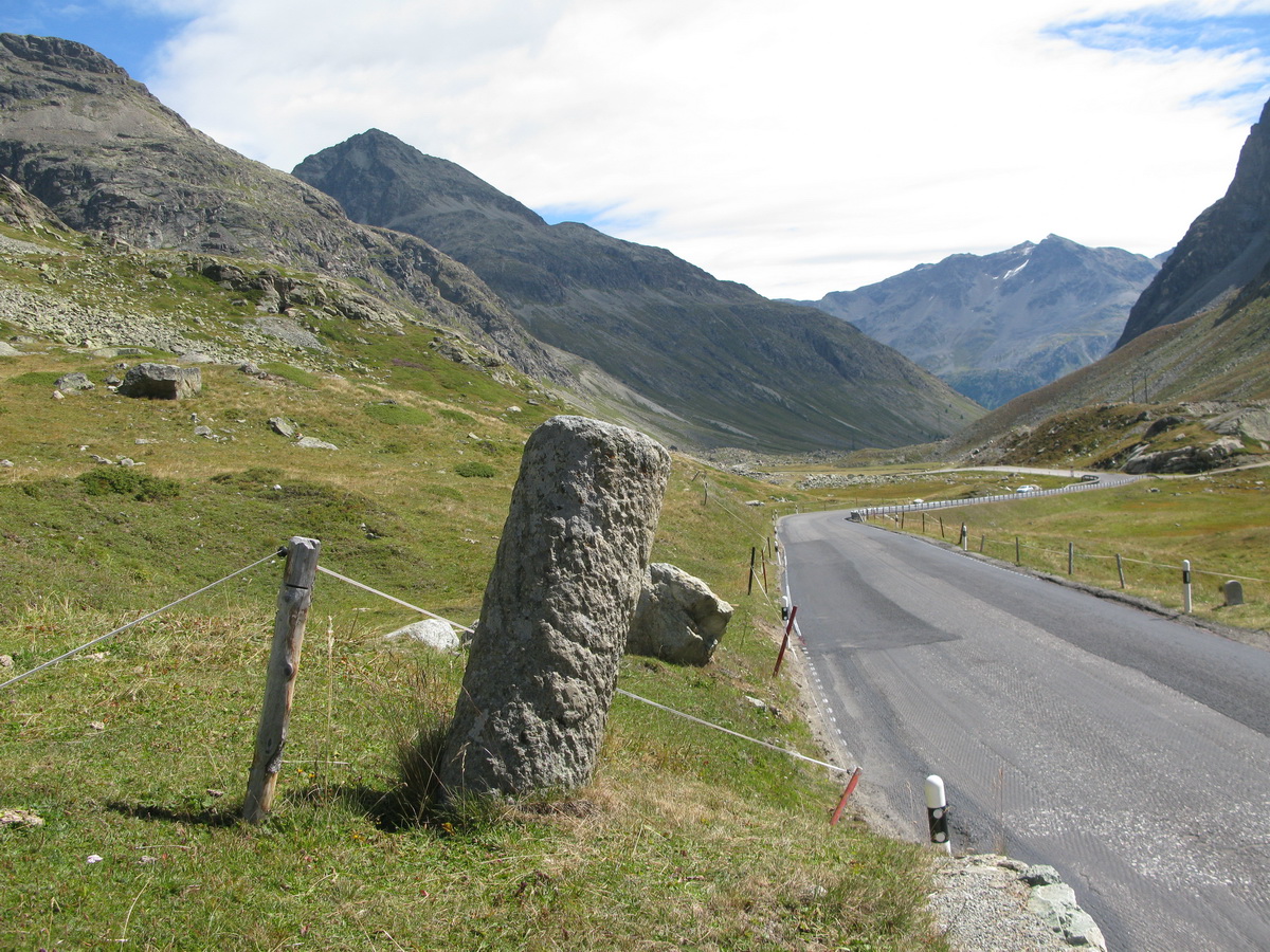 Auto som zaparkoval na prvom odpočívadle nad Silvaplanou. Takto som sa vyhol všetkým tým plateným parkoviskám v údolí. Po asfaltovej rozcvičke nasledoval asfaltový zjazd proti studenému vetru až po dedinku Bivio (1769m). Tu majú dokonca menšie lyžiarske stredisko, práve popod vleky začalo stúpanie na Septimer. Široká štrková cesta dokonale vyklčovanými pasienkami. Tento prechod cez hory používali už starí Rimania. Počas stúpania som rozmýšľal, či si dnes vôbec zajazdím. "Čo ak bude podobná cesta aj do druhej strany?!" obával som sa.