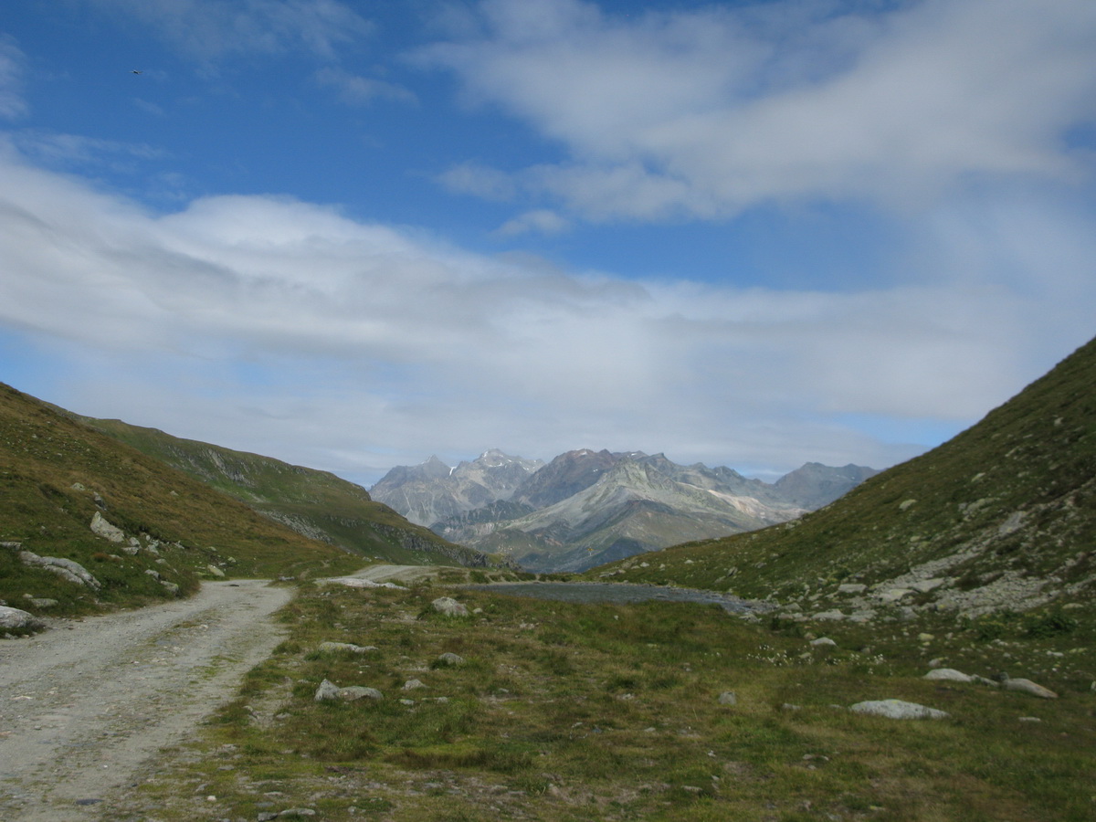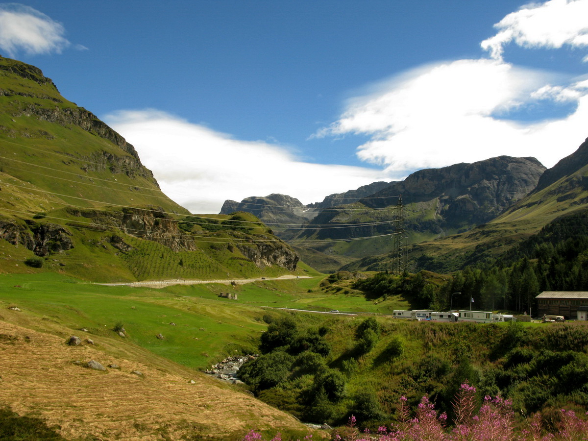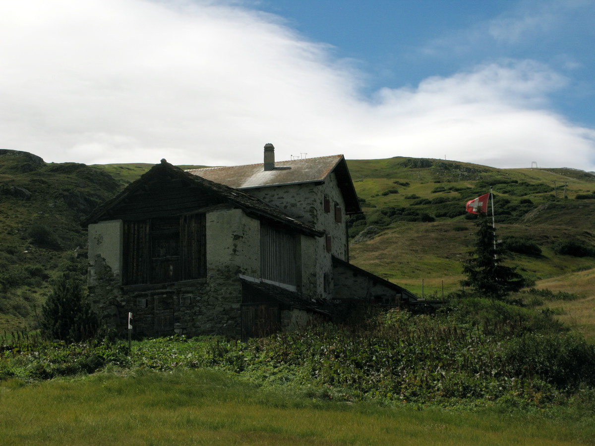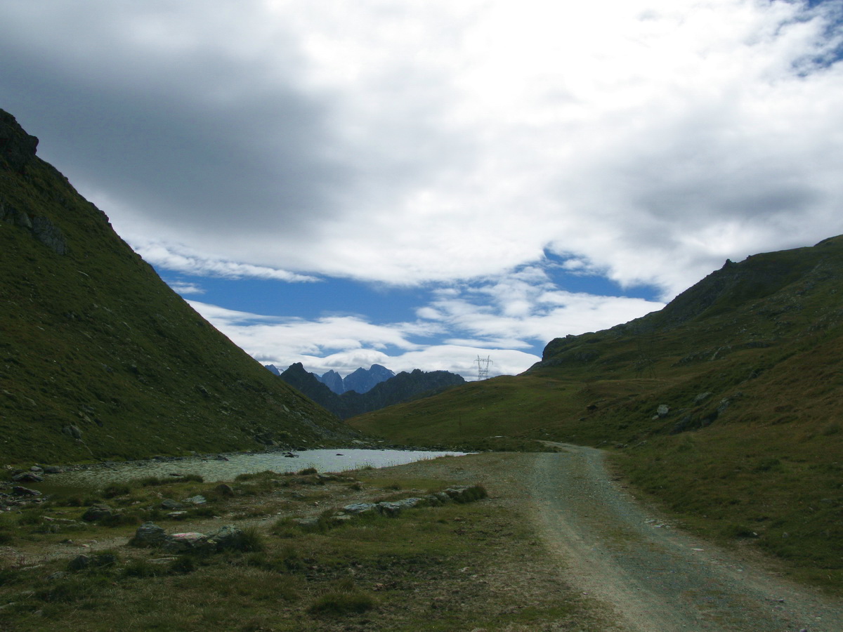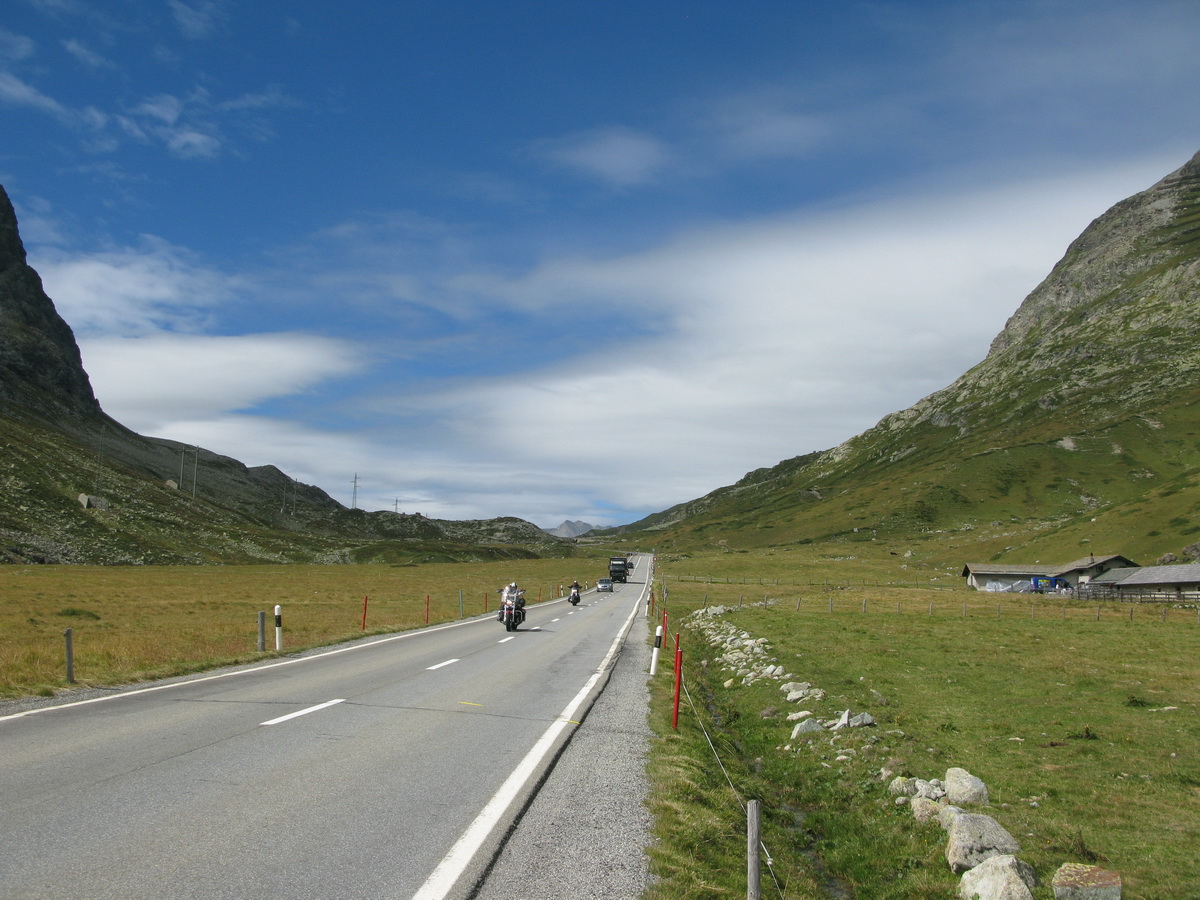 Auto som zaparkoval na prvom odpočívadle nad Silvaplanou. Takto som sa vyhol všetkým tým plateným parkoviskám v údolí. Po asfaltovej rozcvičke nasledoval asfaltový zjazd proti studenému vetru až po dedinku Bivio (1769m). Tu majú dokonca menšie lyžiarske stredisko, práve popod vleky začalo stúpanie na Septimer. Široká štrková cesta dokonale vyklčovanými pasienkami. Tento prechod cez hory používali už starí Rimania. Počas stúpania som rozmýšľal, či si dnes vôbec zajazdím. "Čo ak bude podobná cesta aj do druhej strany?!" obával som sa.