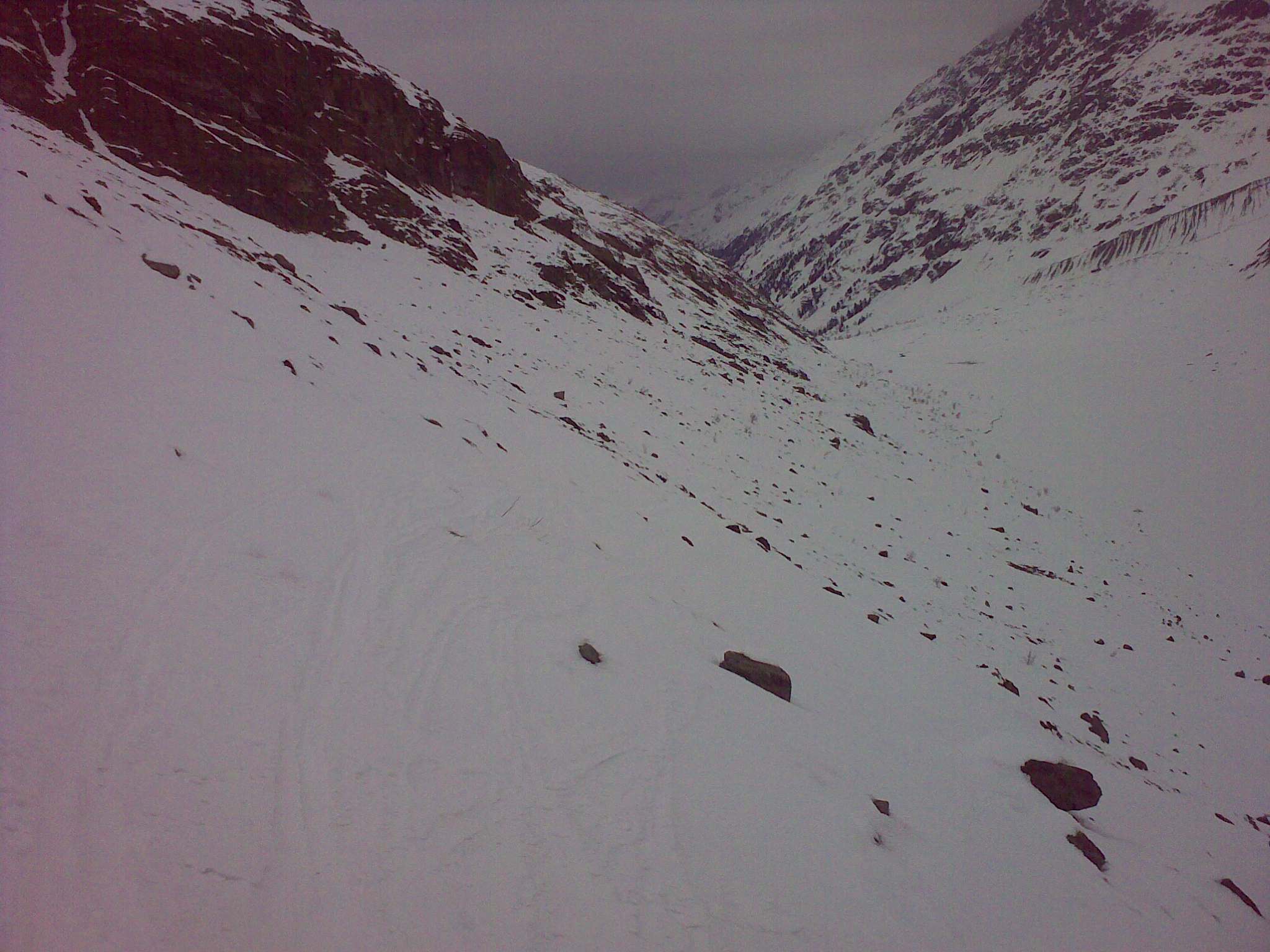 Druhá možnosť je priamo z údolia Roseg Tall okolo jazera Lej da Vadret. Až po jazero je skoro vždy prešliapaný chodník. Výstup od jazera po Coaz je považovaný za dosť nebezpečný, nakoľko treba skoro celý čas traverzovať v prudkom svahu s častými lavínami. Keďže už mesiac nesnežilo a podmienky sa zdali viac ako bezpečné, zvolil som túto druhú možnosť. Počasie ešte držalo, teplota okolo 0°C, nádherné jarné počasie v polovici februára..:-) Až do výšky zhruba 2400 m n.m. bol jarný firn... ďalej už nádherný prašan. Cesta od jediného hotela v doline (Roseggletscher Hotel) trvá ku Coaz Hütte 2,5 hod.