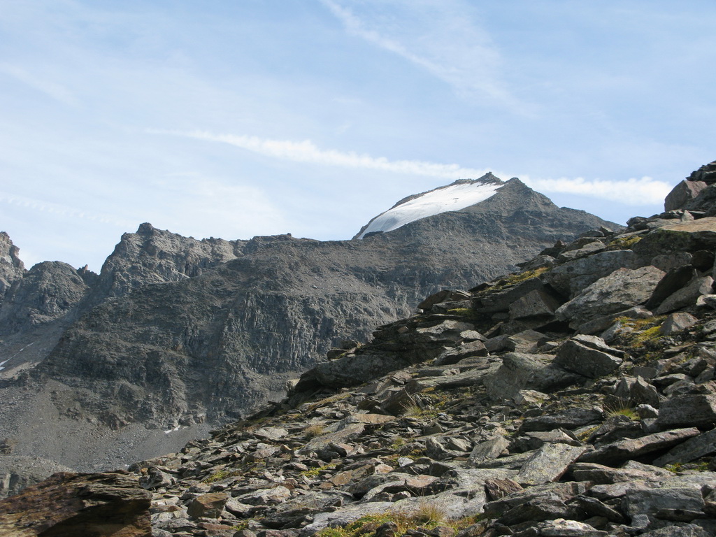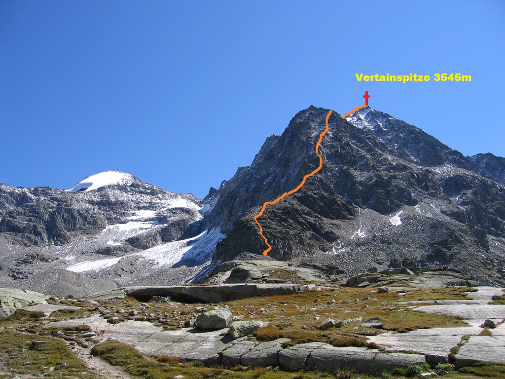 Doliezam na hrebeň. Vertainspitze má dva vrcholy. Pod tým západným je tabuľka. Mladý domáci chalan sa tu zabil asi pred dvoma rokmi. Hrebeň smerom na Angelusscharte je už naozaj ako mínové pole. Ten radšej zo svojich plánov vypustím.