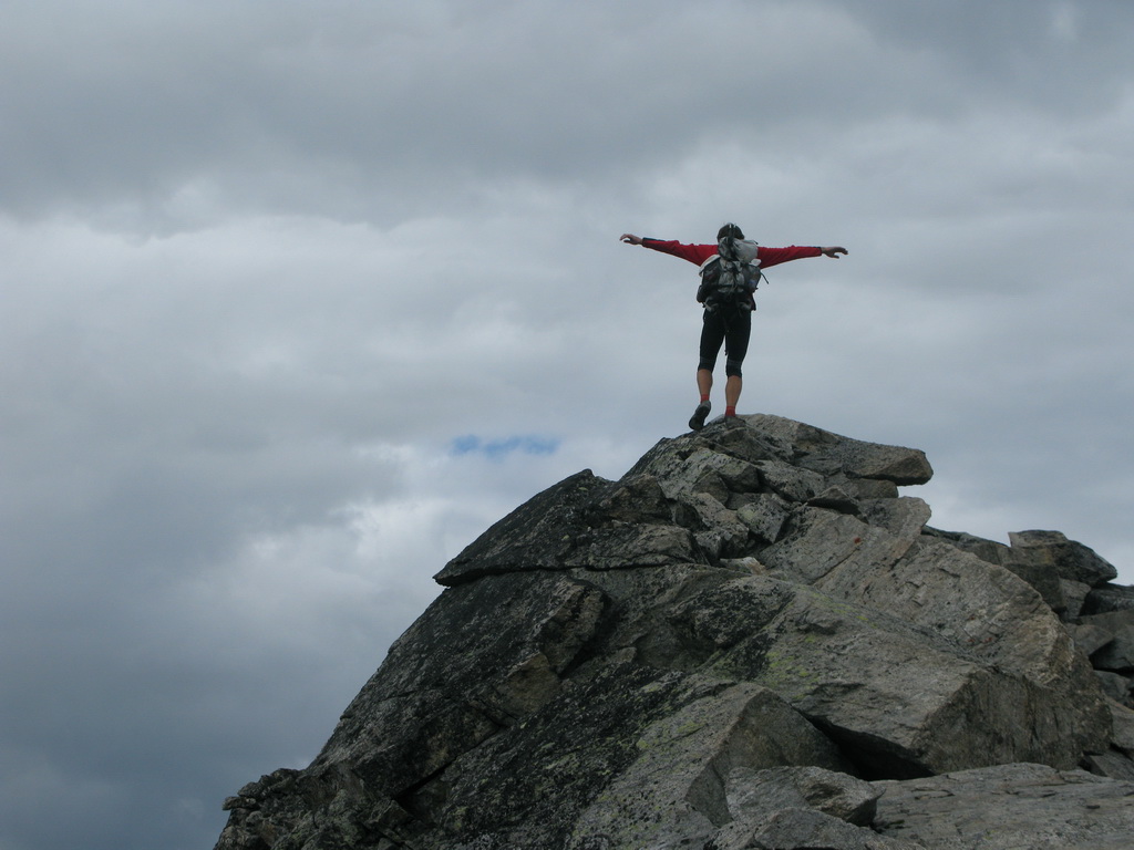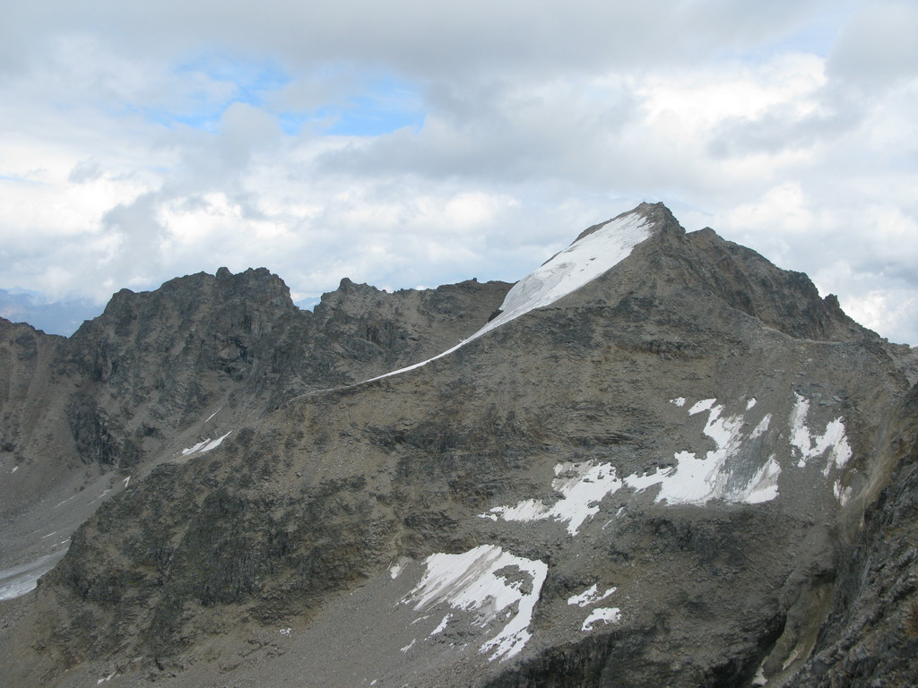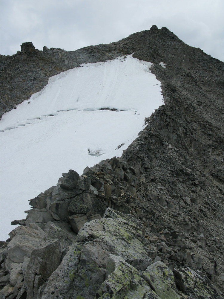 Po prekonaní nepríjemného zliezania, našťastie tiež opatreného záchytným balkónom, ešte síce nasleduje delikátny hrebienok, ale stupy a chyty sú tam, kde majú byť. A keď aj hlava je tiež... tak by nemal byť problém. Záverečný hrebienok z jednej strany olizuje snehové pole zmenšujúceho sa ľadovca severnej steny. Musel som ísť dokonca aj dva metre po snehu. Skaly sú tu na sebe naukladané tak, akoby sa mali každú chvíľu zosypať - takže pozor!