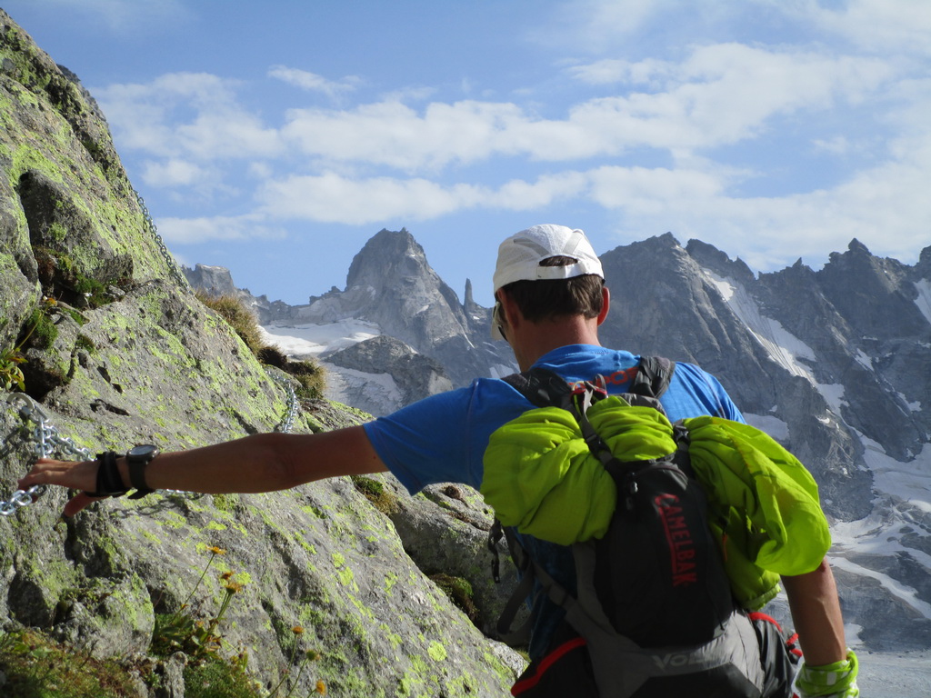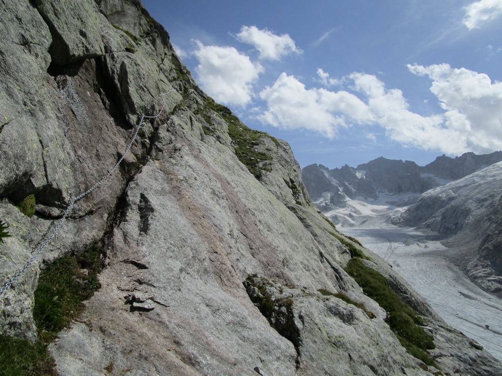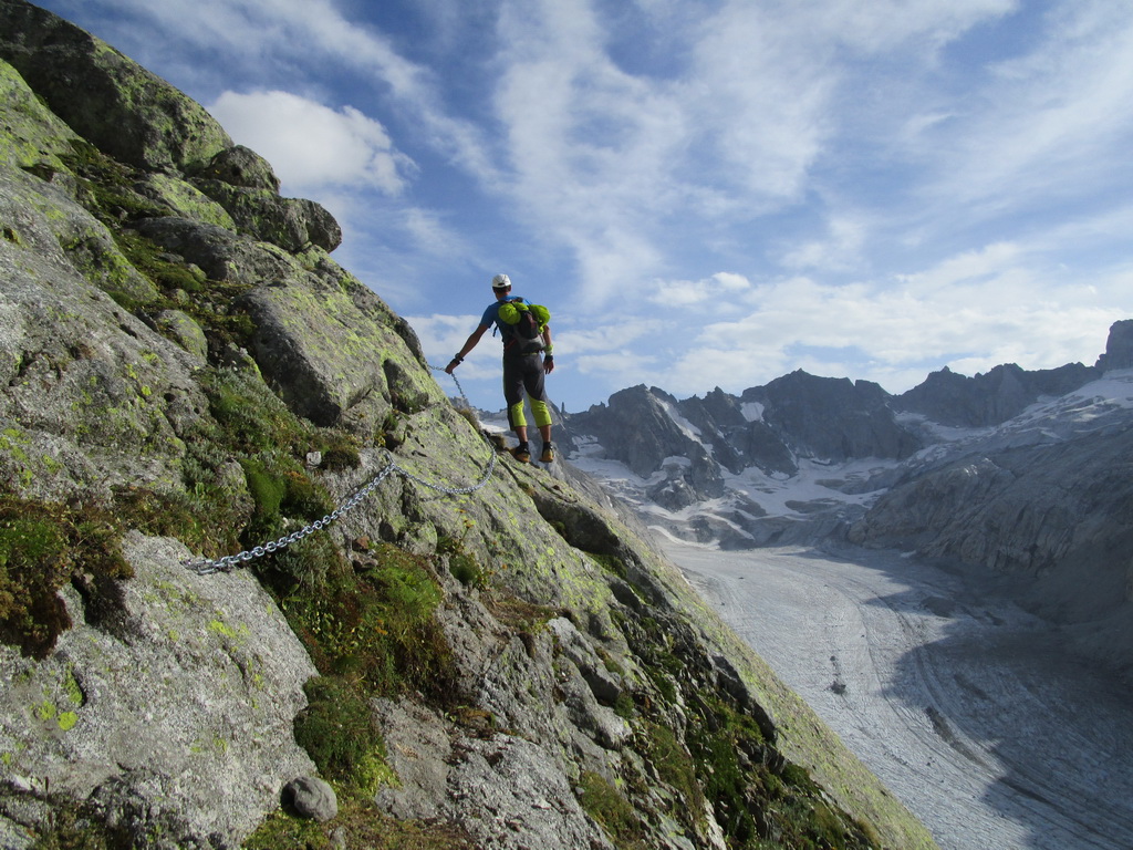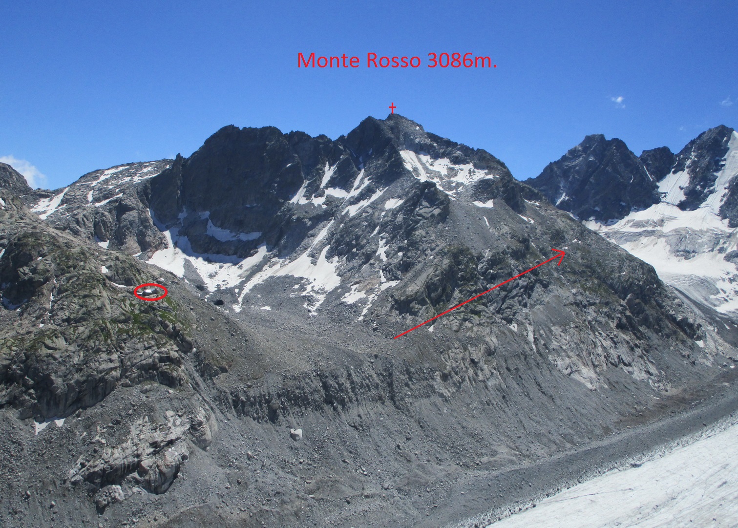 Normálnym turistickým tempom výstup od chaty na vrchol Monte Rosso trvá dve hodiny a prekonáte pri ňom cca 600 výškových metrov. Od chaty začínam klesať chodníčkom najprv mierne dole. Neďaleko vidieť veľkú ľadovcovú jaskyňu. Traverzujem ľadovcom vyhĺbenú dolinku a začínam stúpať miernym traverzom. Čoskoro začínajú prvé reťaze. Je ich tu požehnane ale vďaka nim už nie je potrebné ďalšie značenie a človek vie, že v prípade dažďa by nemal problém sa po žulových platniach vrátiť naspäť.