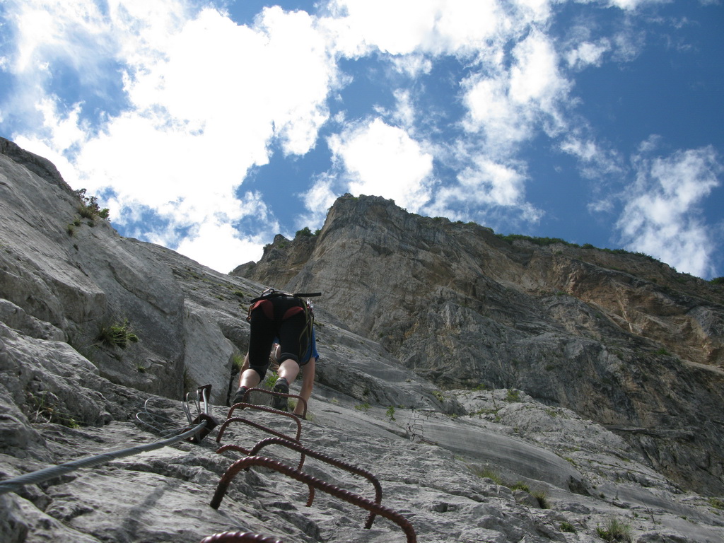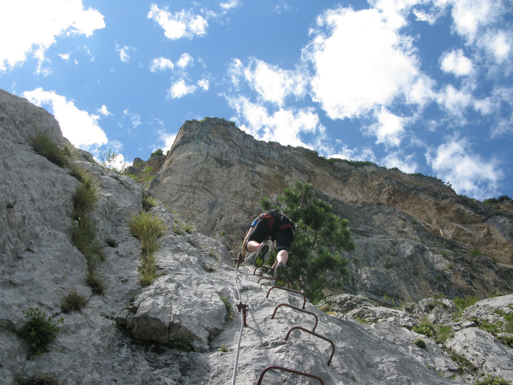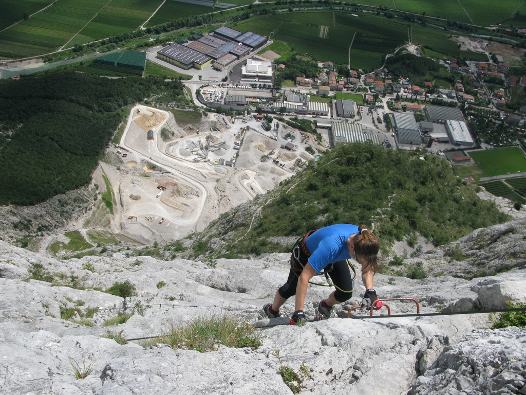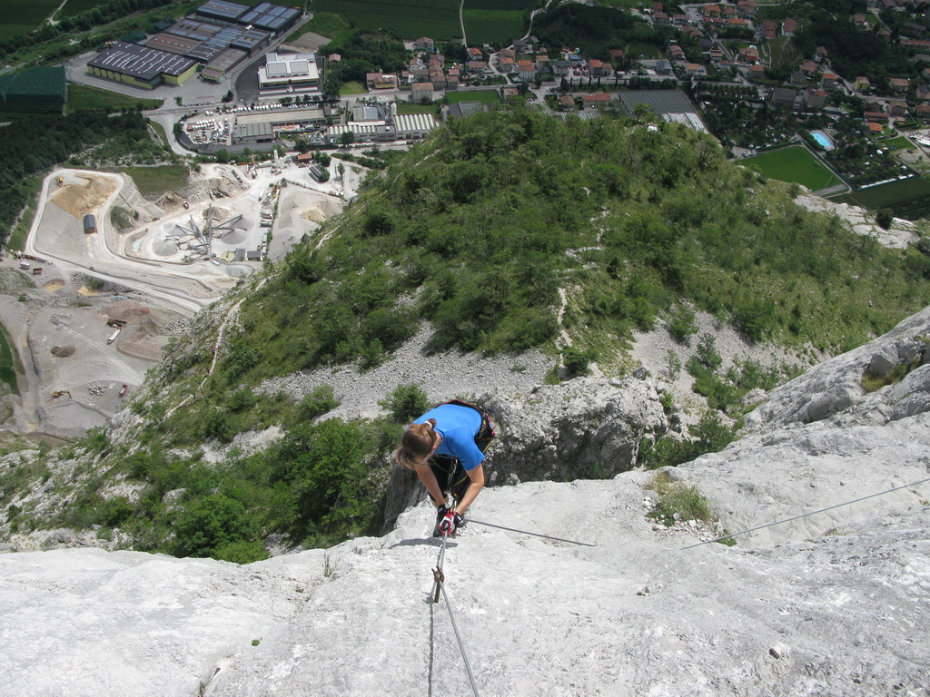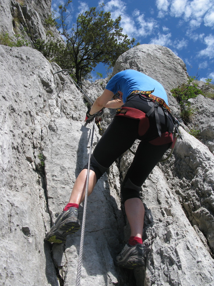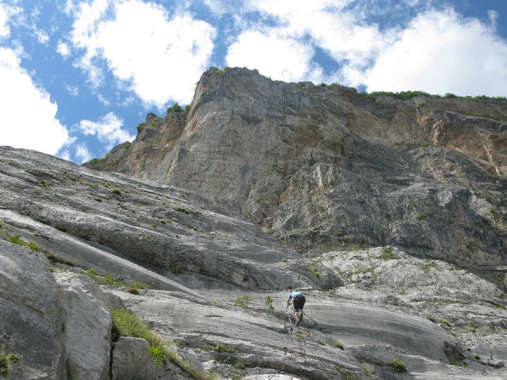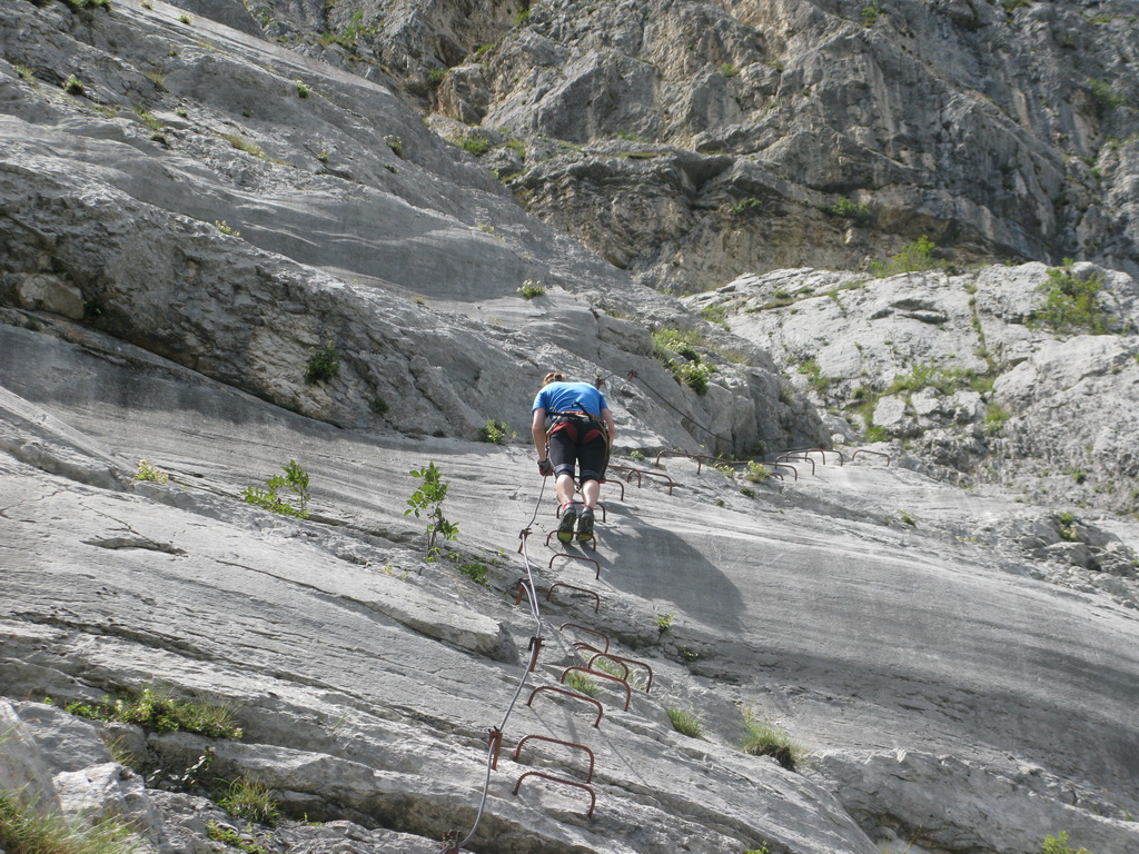 Ťažšie pasáže striedajú ľahšie. Všetko v krásnom vápenci. Máme šťastie na počasie a tak sa nevieme nabažiť úžasných výhľadov. V hornej časti na kramlách sa už prestávame poctivo zacvakávať, čo výrazne zvýši našu rýchlosť. Počas občerstvovacích prestávok pozorujeme vrtuľník ako niekoľkokrát nalietava do steny smerom na Sarché. Zrejme záchranná akcia. Všade naokolo sú aj lezecké cesty.
