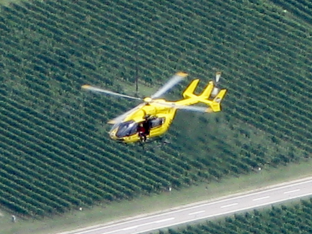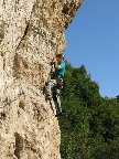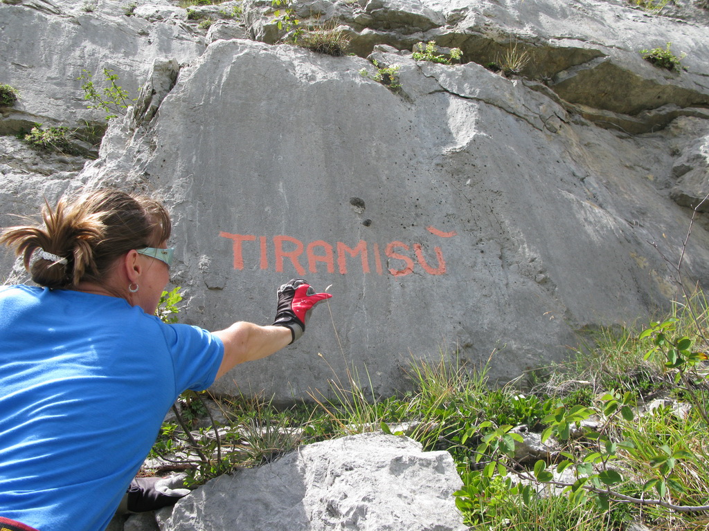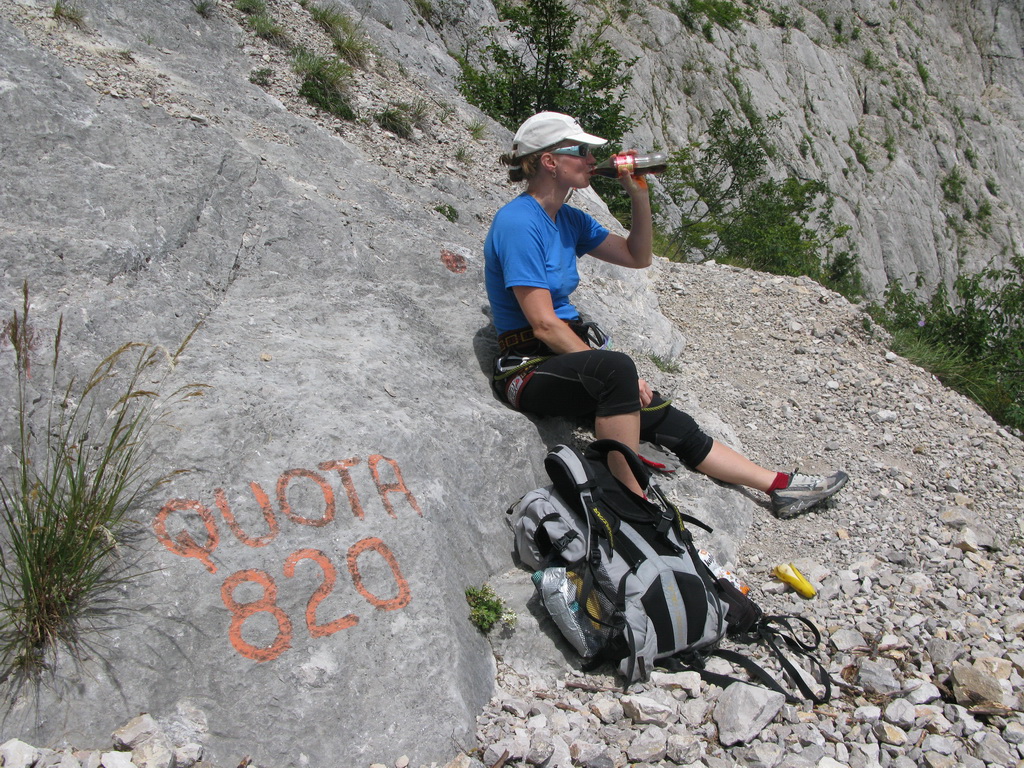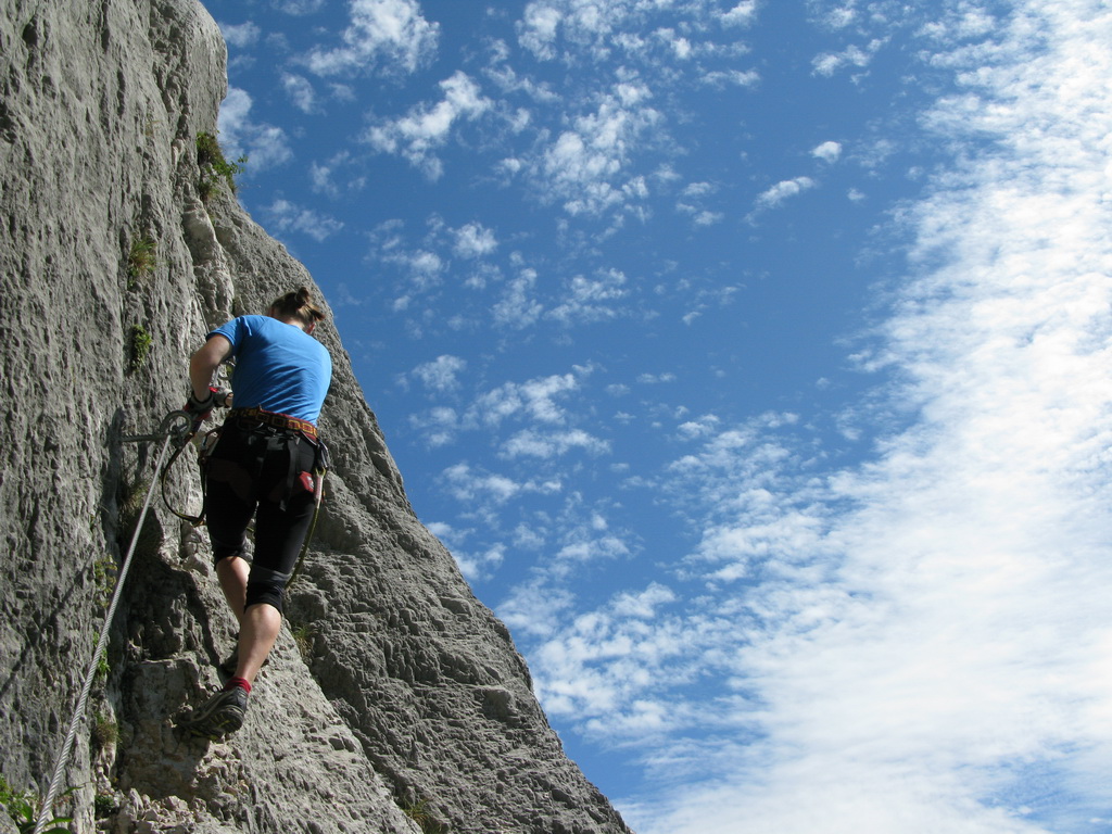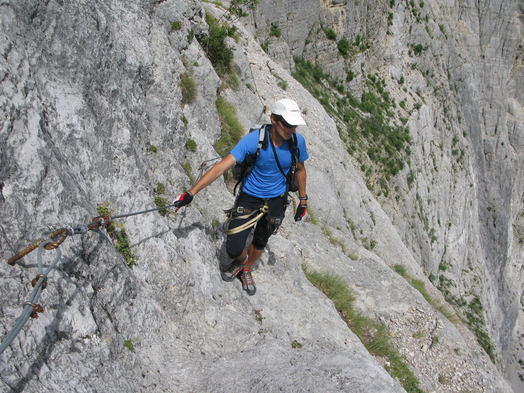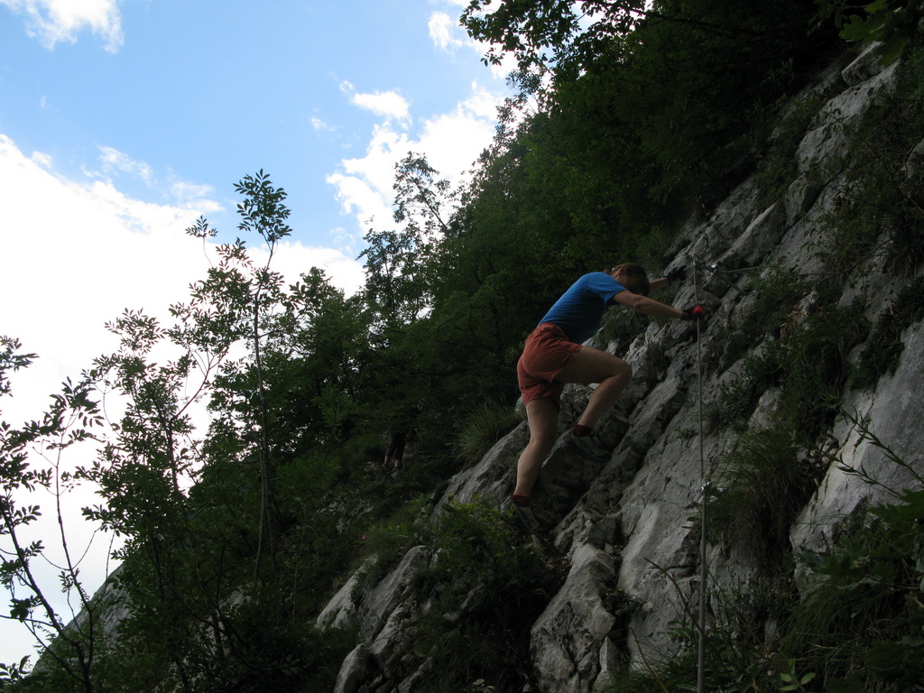 Ťažšie pasáže striedajú ľahšie. Všetko v krásnom vápenci. Máme šťastie na počasie a tak sa nevieme nabažiť úžasných výhľadov. V hornej časti na kramlách sa už prestávame poctivo zacvakávať, čo výrazne zvýši našu rýchlosť. Počas občerstvovacích prestávok pozorujeme vrtuľník ako niekoľkokrát nalietava do steny smerom na Sarché. Zrejme záchranná akcia. Všade naokolo sú aj lezecké cesty.