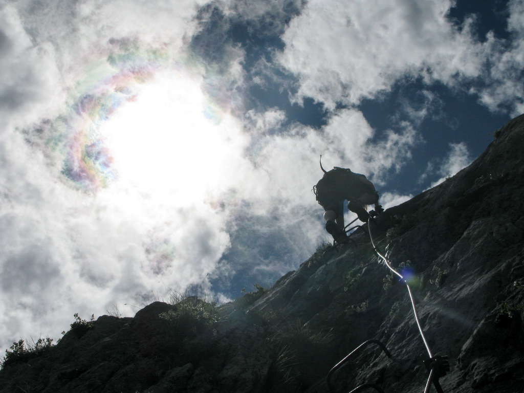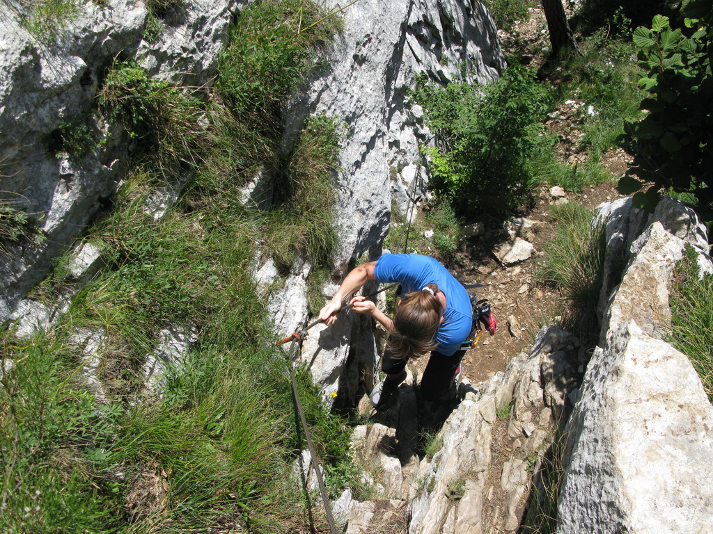 Tak sa aj stalo. V kľúčovom mieste sme si po niekoľkých prieskumných výpadoch spomenuli na jej slová. "Stále po hrebeni!" a odbočku sme našli. Nevšimli sme si žiadny dôvod, prečo by chodník mal byť zavretý. Celá ferrata ja zaistená úplne novým lanom, je to ľahké, už sme sedačky ani nevyťahovali.