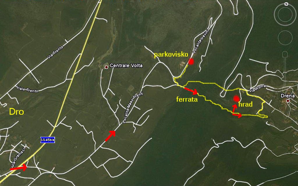 Taliansko - Lago di Garda - Arco. Začiatkom októbra sa v mekke lezcov a bikerov prebúdzame do zamračeného a upršaného dňa. Na vrcholkoch hôr pomedzi prevaľujúce mraky vidieť sneh. Čas je vzácny, dážď pomaly prestáva a tak sedím nad mapou, že čo s načatým dňom. Kúsok nad Arcom je mestečko Dro a nad ním objavujem ferratu vedúcu ku hradu Drena. Podľa mapy to vyzerá nenáročné, krátke s krátkym nástupom. Nízka nadmorská výška zaručí príjemnú teplotu. Využijem ešte dostupnosť internetu a pozriem sa na stránku via-ferrata.de, ferratu čoskoro nájdem a po niekoľkých fotkách je rozhodnuté: ideme!